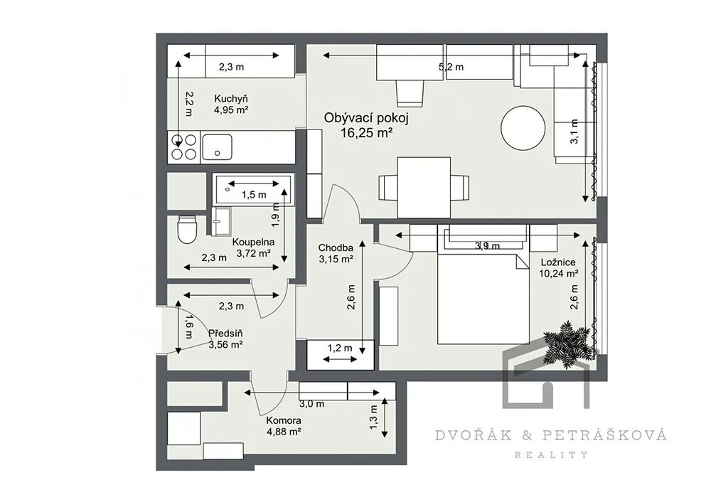 Realitní společnost Dvořák & Petrášková reality vám nabízí k pronájmu byt v osobním vlastnictví o dispozici 2+kk o celkové ploše 47 m2. Neplatíte provizi RK. Prohlídky jsou možné od 1.12.2025.