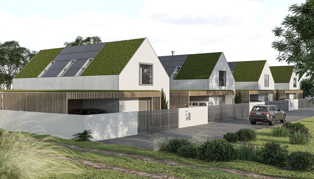 Díky velkým proskleným plochám a posuvným portálům se dům přirozeně otevírá do zahrady, která plynule přechází do okolní přírody. Dvě prostorné terasy nabízejí ideální prostor pro relaxaci, grilování nebo ranní kávu s výhledem do zeleně. Součástí pozemku je i krytý přístřešek pro dvě auta s přípravou na nabíječku pro elektromobil a s integrovanou kolnou třeba na zahradní nářadí či zimní kola od aut.