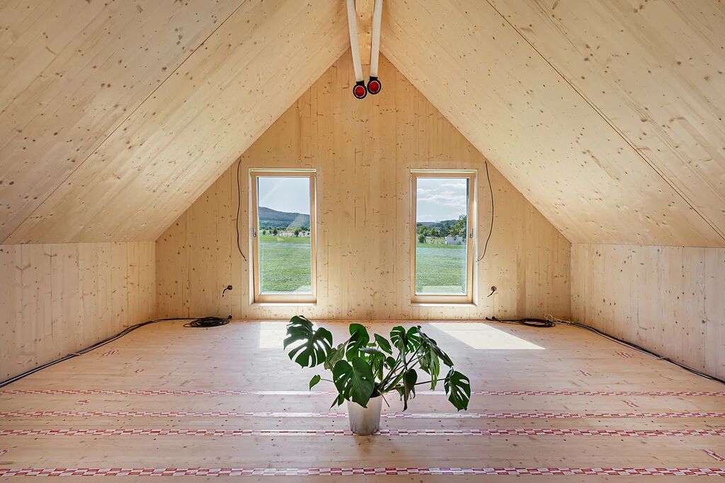 Tato dvoupodlažní dřevostavba je postavena z CLT panelů Novatop => žádné lehké duté OSB stěny, ale poctivé masivní dřevo. Fasáda a střecha jsou provětrávané, izolované přírodním dřevovláknem => žádný polystyren. Výsledkem je nízkoenergetický dům v energetické třídě A s velmi nízkými provozními náklady z udržitelných ekologických materiálů.