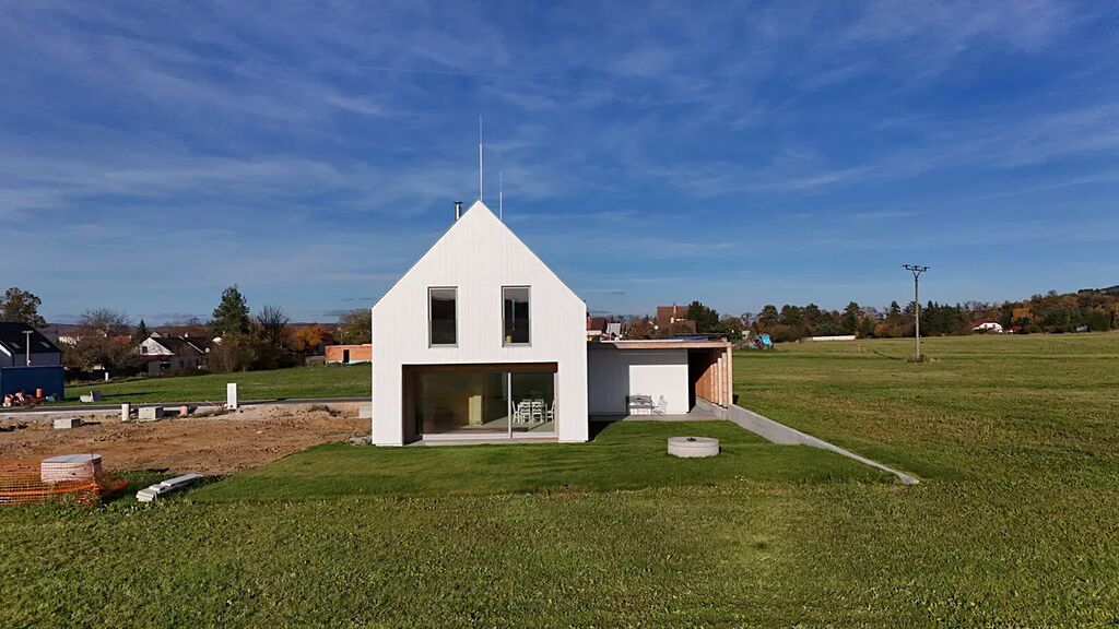 Dům je v podstatě k nastěhování – dokončený ve fázi Shell & Core, tedy plně funkční a připravený k individuálnímu dokončení interiéru dle vašich preferencí a stylu (finální podlahy, vnitřní dveře, koupelna, kuchyně…). My se ještě chystáme vysadit zelenou střechu.