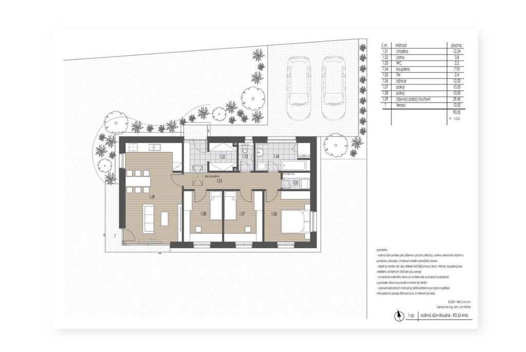 Dispozice: samostatné WC(2,2m2), tech.místnost(2,4m2), koupelna s WC(7,95m2), obývací pokoj s kuch.koutem (29,45m2), chodba (12,24m2), 3 ložnice (12m2, 10m2, 10m2), šatna (3,8m2)+úložný prostor na půdě (možnost obytné podkroví).