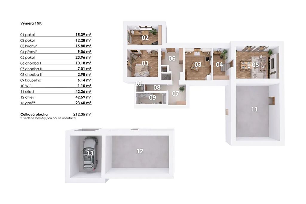 Praktické zázemí pro parkování, úschovu zahradní techniky nebo další hobby aktivity.