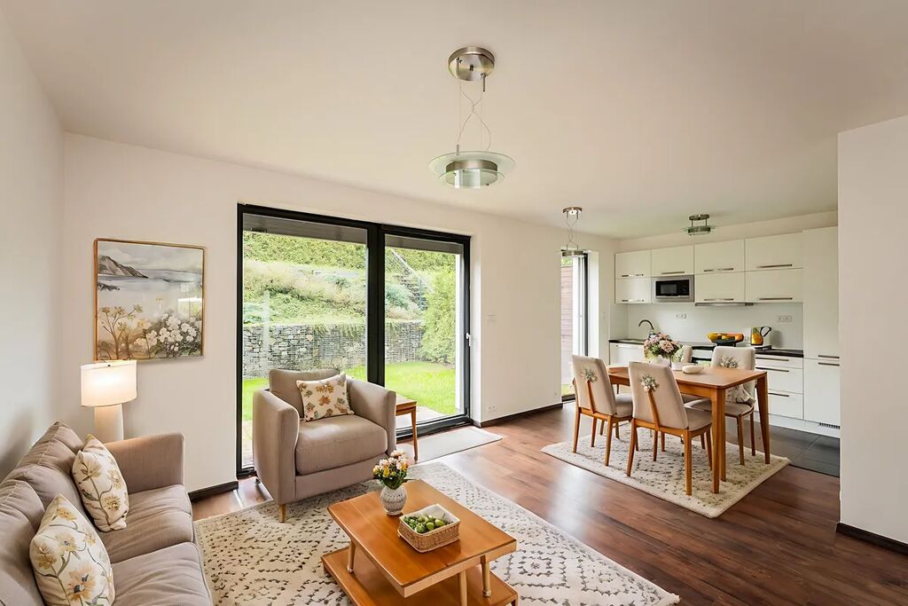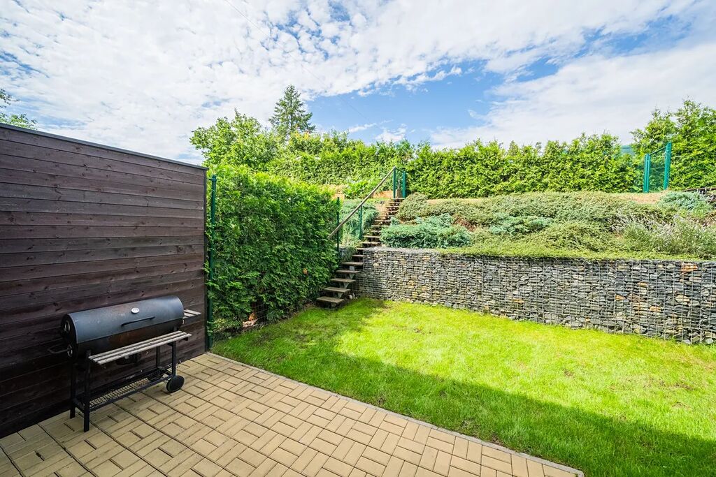 Dům je rozložen do dvou podlaží s podlahovou plochou 110 m². Obytná plocha 91 m² je rozdělena do dispozice 4+kk, která zahrnuje čtyři pokoje a kuchyňský kout. Jižně orientovaná terasa o rozloze 16 m² zajišťuje dostatek světla po celý den. K domu patří zahrada o rozloze 88 m², ideální pro relaxaci a venkovní aktivity, a garáž o velikosti 19 m² s dvěma dalšími parkovacími místy před domem.