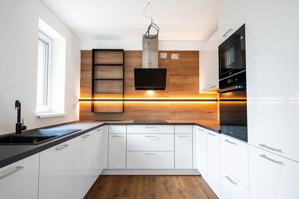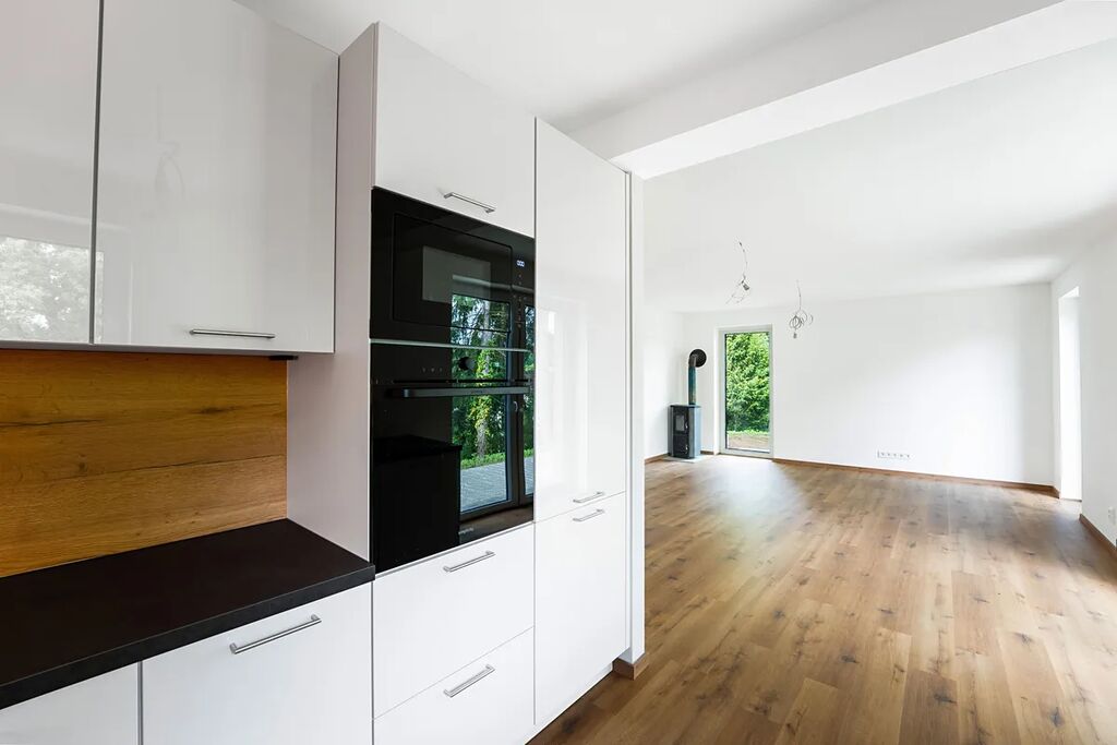 Prostorný obývací pokoj s velkou moderní kuchyňskou linkou a přímým vstupem na terasu, která obklopuje téměř celý dům. Prezentujeme kuchyni z domu C a dům C, který je již pronajatý. Aktuální dům B a kuchyně bude inzerována po její instalaci začátkem prosince 2025. Domy jsou postavené ve stejném standardu.