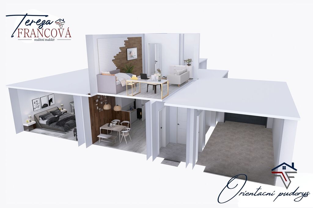 Po vstupu do domu vás uvítá vstupní předsíň se vstupem do garáže, kde pohodlně zaparkujete. Zádveří navazuje na spíž, kterou lze upravit například na další koupelnu. Chodba vede do velké jídelny s kuchyňským koutem, na který navazuje pokoj s výhledem na zahradu. Odtud se dostanete i k dřevěnému schodišti do podkroví, kde je umístěn prostorný pokoj s krásným výhledem do okolí. V přízemí dále najdete samostatný pokoj a další místnost průchozí na prosklenou verandu – ideální pro zimní zahradu či klidové posezení. Koupelna se sprchovým koutem a WC je situována poblíž schodiště, v blízkosti dalších místností vhodných jako komory či dílna.