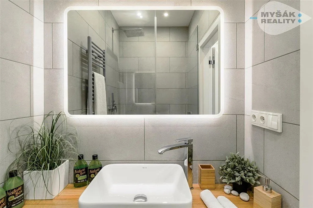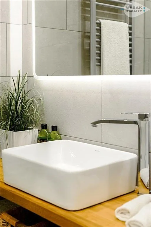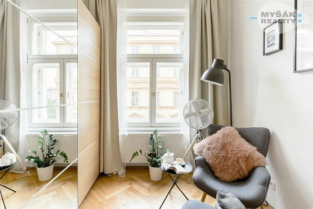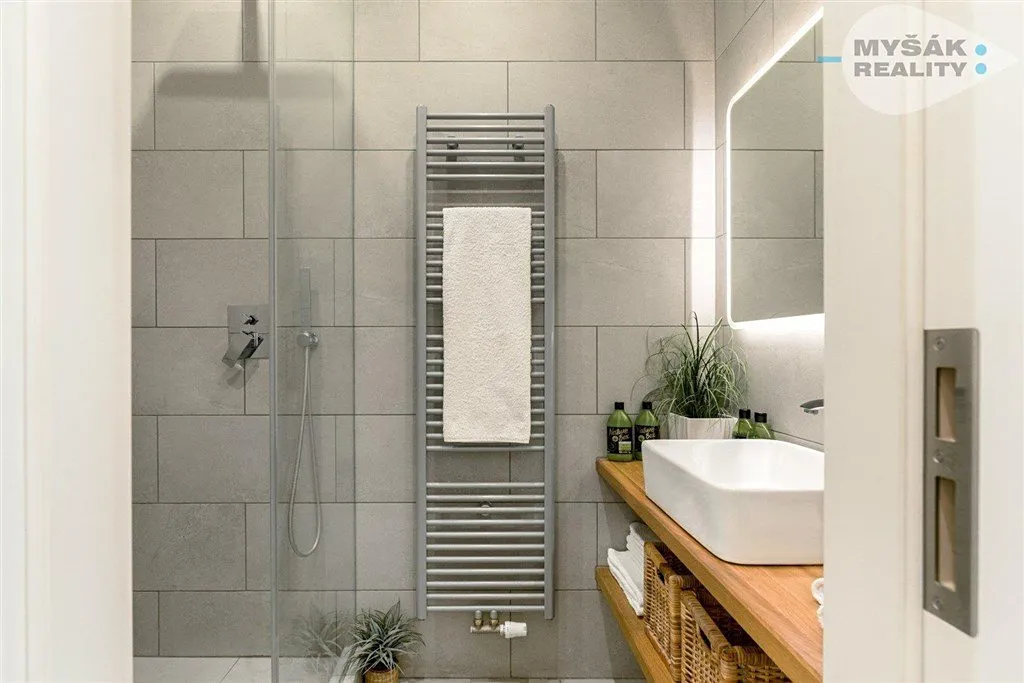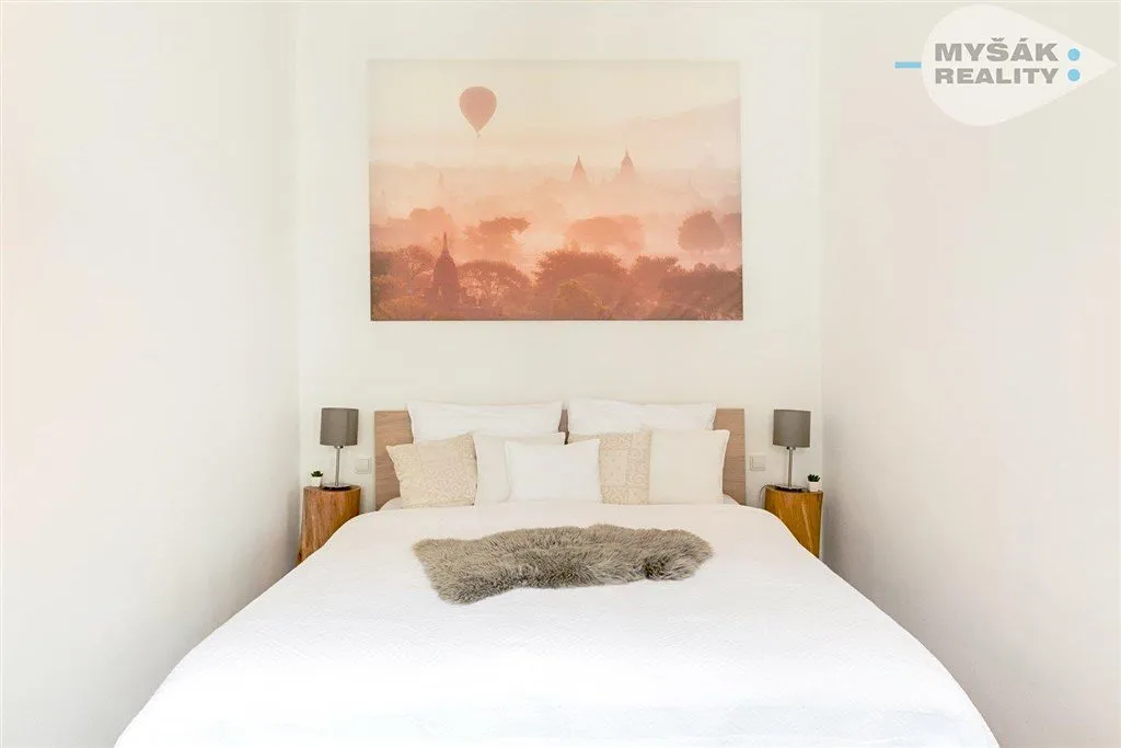 Po vstupu do bytu se nacházíte v chodbě, ze které se dostanete na samostatnou toaletu, dále do koupelny s prostorným sprchovým koutem a velkou dešťovou sprchou. Obývací pokoj má plně vybavenou kuchyni a měří 21m2. Ze spotřebičů zde najdete indukční varnou desku, mikrovlnku s troubou v jednom, lednici s mrazákem, kávovar Nespresso, varnou konvici a toaster. Dále se v obývacím pokoji nachází TV s kabelovým připojením. Velkými francouzskými dveřmi vedou na menší balkon. Po 2 schodech se dostanete do neprůchozí ložnice o rozloze 16m2. Byt je vybaven detektorem kouře a detektorem CO2. Dobré úložné prostory nabízí technická místnůstka, která je vybavena pračkou se sušičkou.