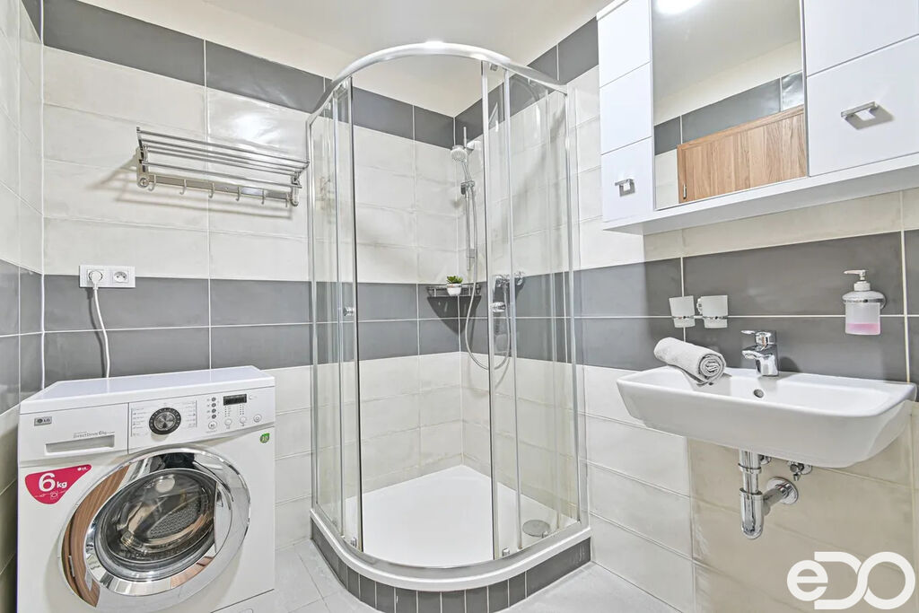Kuchyňská linka je vybavena (trouba, varná deska, digestoř, lednice s mrazákem). Součástí pronájmu je i pračka.