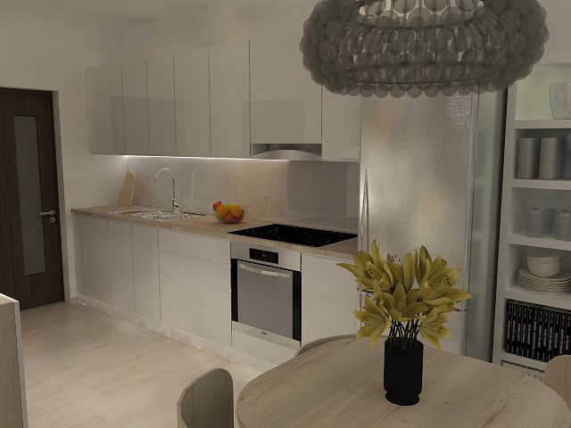 Tento vzdušný byt je vybaven moderní kuchyňskou linkou na míru s velkým úložným prostorem a vestavěnou sklokeramickou deskou, elektrickou troubou, digestoří a velkým osvětlením pracovní desky. Při rekonstrukci byly použity kvalitní materiály. Podlahovou krytinu tvoří koberce a dlažba. Byt má vlastní elektroměr, vodoměr i připojení k internetu.