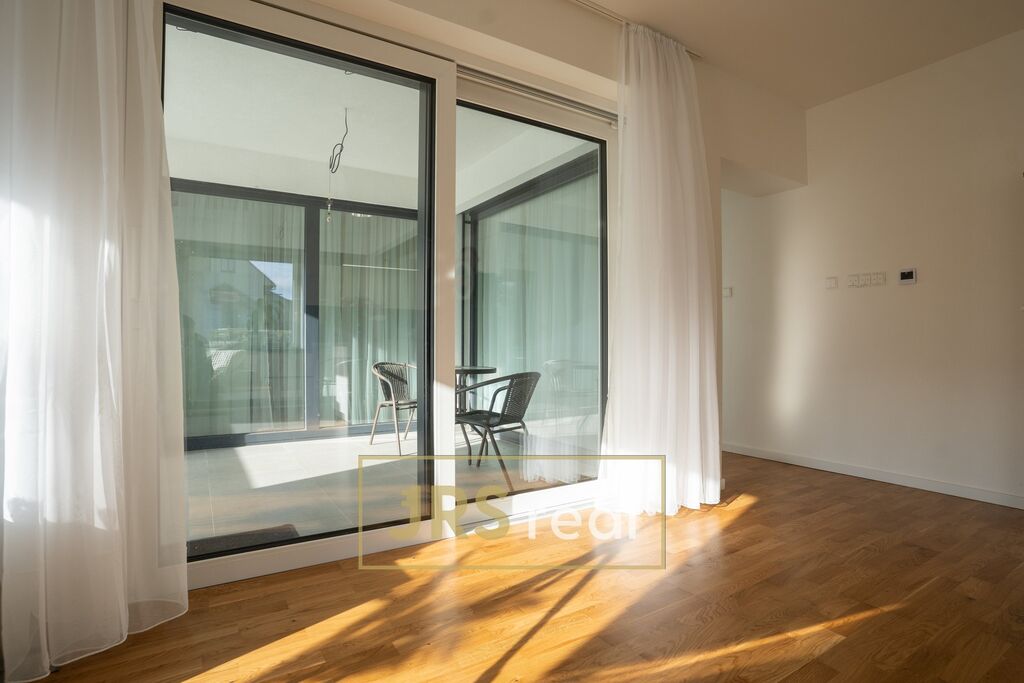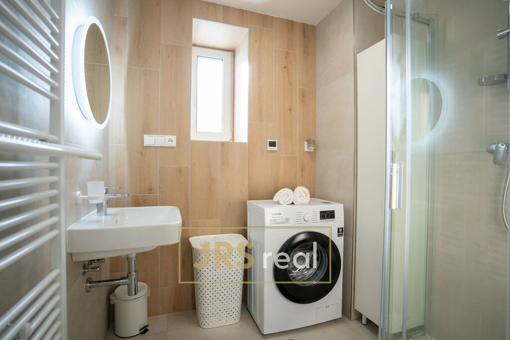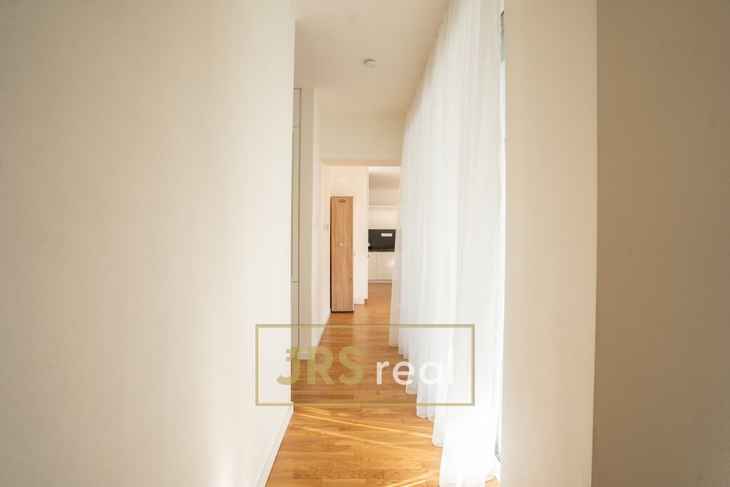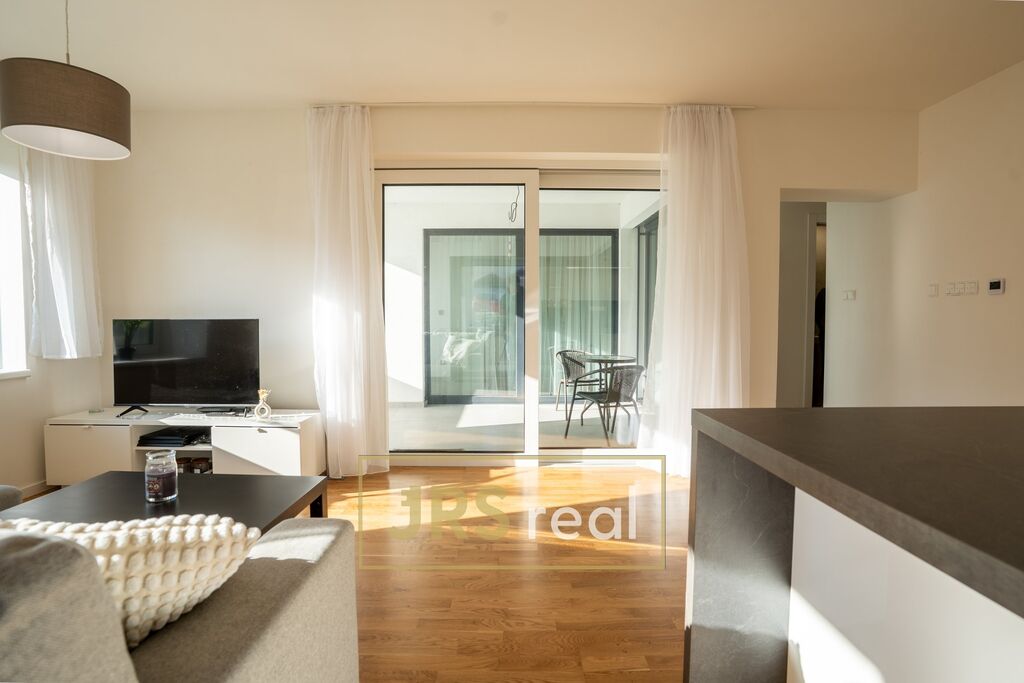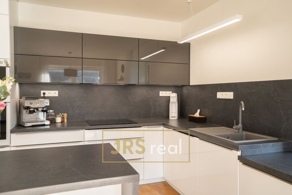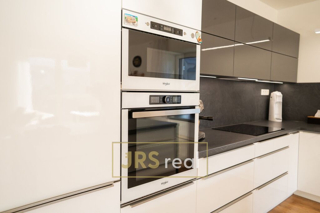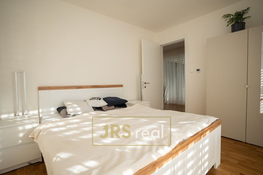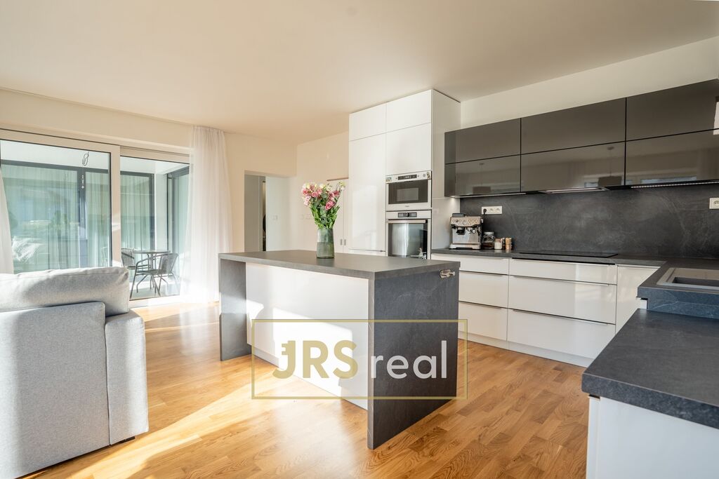 Obývací pokoj je propojen s moderní kuchyňskou linkou vybavenou vestavnými spotřebiči a praktickým kuchyňským ostrůvkem. Dřevěná podlaha, podlahové vytápění a kvalitní materiály zajišťují maximální komfort. Vstupní chodba nabízí velkorysé vestavné skříně, koupelna disponuje sprchovým koutem a byt je vybaven předokenními roletami, které poskytují dokonalé soukromí. Součástí prodeje jsou také dvě venkovní parkovací stání a sklepní kóje o velikosti 3 m².