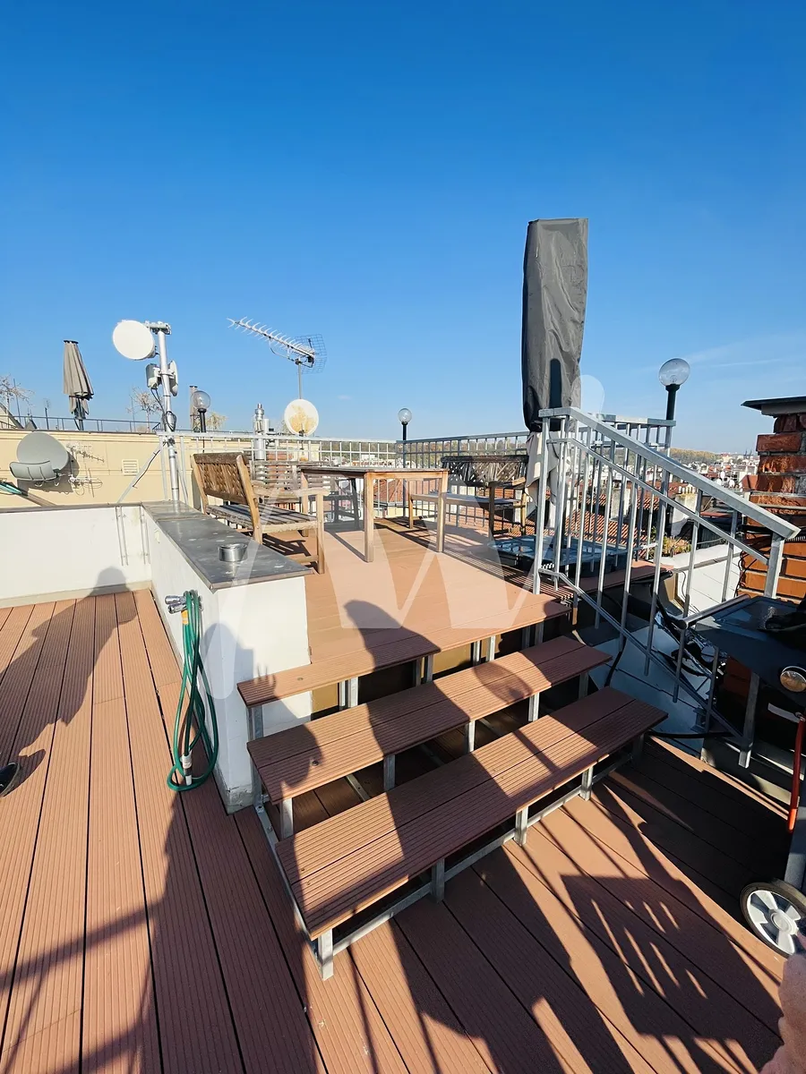 Nabízíme k pronájmu unikátní mezonetovou kancelář s klimatizací a soukromou terasou s výhledem na Pražský hrad.