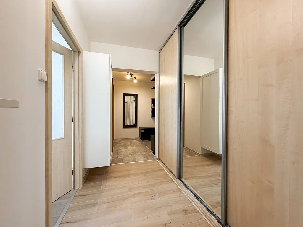Najdete zde obývací pokoj s moderní kuchyňskou linkou (myčka, trouba, varná deska, digestoř), ložnici s velkou postelí a vestavěnými skříněmi, dětský či pracovní pokoj s úložnými prostory a pracovním místem, moderní koupelnu s vanou a toaletou a praktickou vstupní chodbu s velkým zrcadlem a dostatkem úložného prostoru. Lednice, pračka a mikrovlnná trouba budou doplněny. Veškeré vybavení, které je vidět na fotografiích, zůstává v bytě.