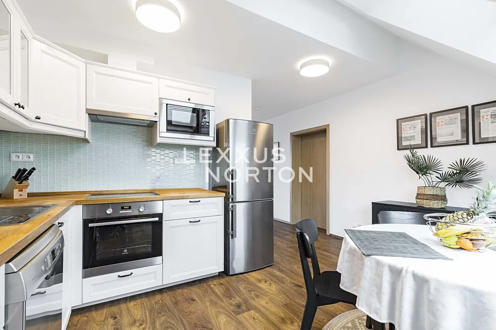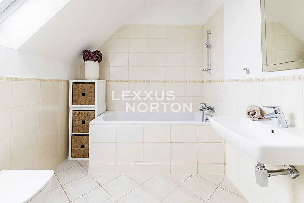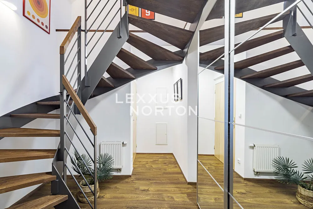 Spodní úroveň bytu tvoří otevřený obytný prostor s kuchyní a jídelním koutem, na který navazuje prostorově oddělený obývací pokoj se vstupem na terasu orientovanou západním směrem do klidného vnitrobloku. V této úrovni se dále nachází rodičovská ložnice, koupelna a vstupní hala. O patro výše je situována druhá ložnice s vlastní lodžií a výhledem do okolní zástavby, spolu s koupelnou s vanou. Díky této promyšlené dispozici nabízí byt nadstandardní míru soukromí a jasné oddělení denní a noční části. Byt je orientován na západní a východní stranu.