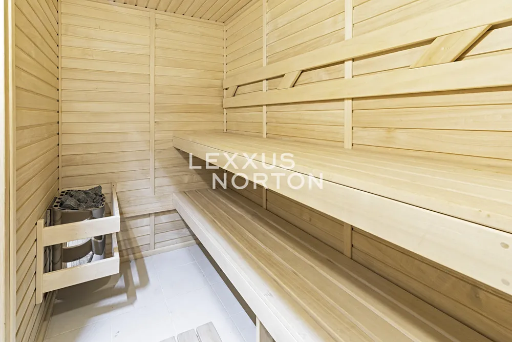 Kuchyňský kout je plně vybavený sporákem, troubou, lednicí, mrazákem a myčkou. V bytě jsou kombinované dřevěné podlahy a dlažba a k dispozici je také klimatizace. Součástí bytu je i sauna. K dispozici jsou dvě koupelny - jedna s vanou, toaletou a bidetem, druhá se sprchovým koutem a toaletou.