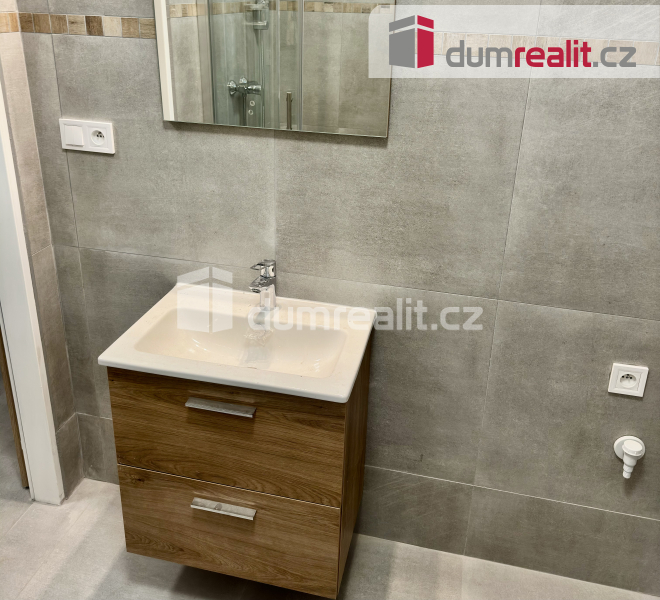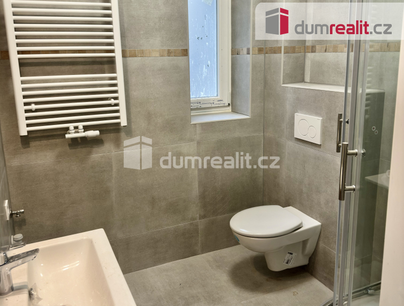 V koupelně jsou keramické kvalitní obklady a dlažba, je zde sprchový kout a umyvadlová sestava se skříňkou, toaleta zavěšená.