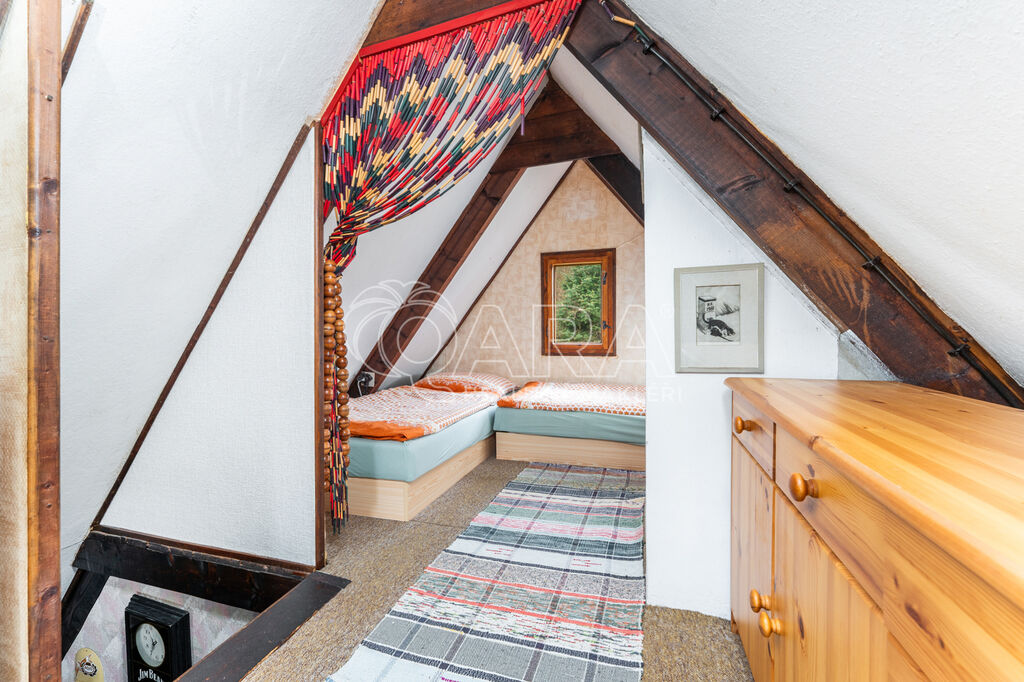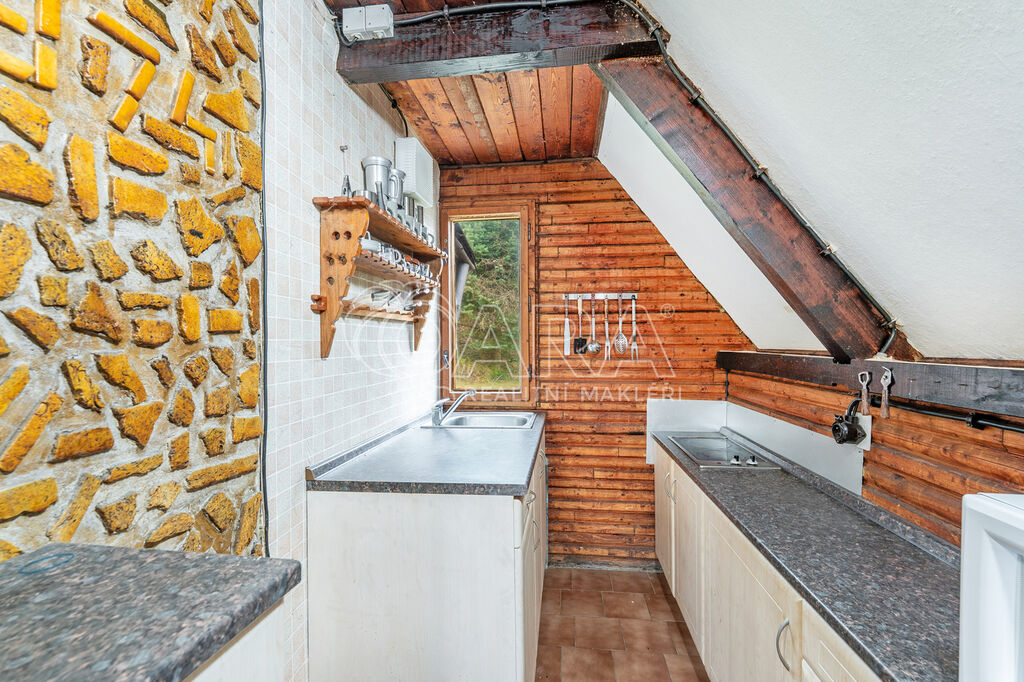 Prodej stylové dřevěné chaty na oblíbeném místě Slapy - osada Lahoz, v naprostém klidu a soukromí, díky umístění na konci slepé uličky. Chata je na vyvýšeném terénu, tudíž z pozemku a terasy je pěkný výhled do okolí. V přízemí se nachází obývací pokoj s krbovými kamny, kuchyňský kout, koupelna s WC a předsíň. V prvním patře pak ložnice opticky rozdělena na dvě části po dvou lůžkách a vstupem na balkon. Celá chata je podsklepena se vstupem z příjezdové cesty a prostor je rozdělen do několika částí - garáž/ úložné prostory, místnost pro posezení s krbem, sprcha a prostorná sauna. Do chaty je zavedena celoroční obecní voda a elektřina. Pohodlné parkování pro několik vozů přímo na pozemku.