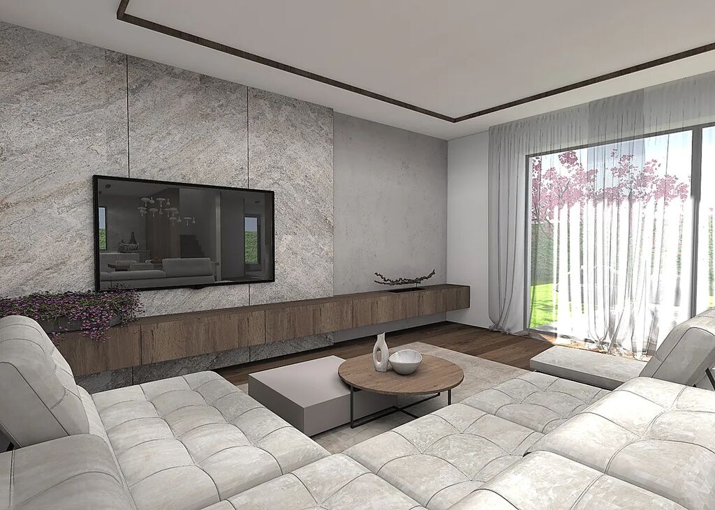 - plastová okna v barvě antracit (z interiéru v barvě bílé), s izolačním trojsklem, v obývacím pokoji v provedení HS portál.