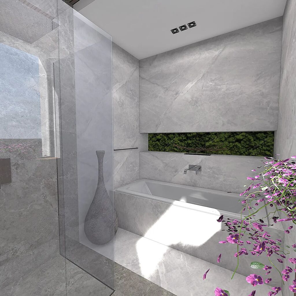 - bezrámová skleněná příčka s dveřmi u vstupu a v šatně