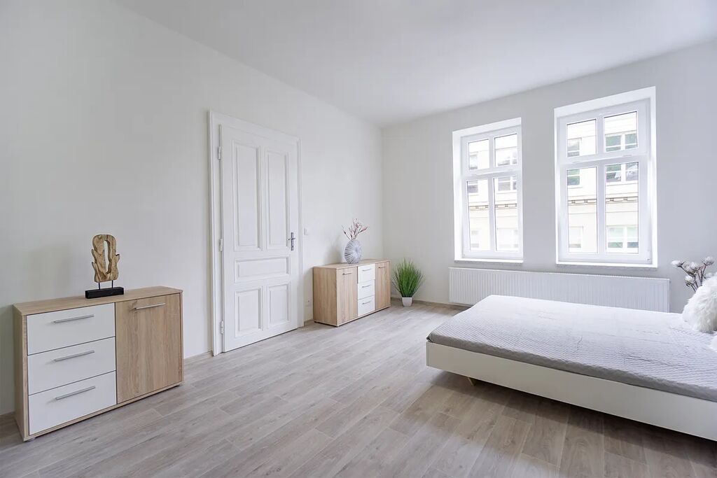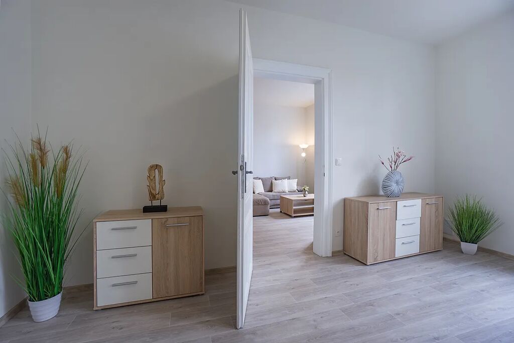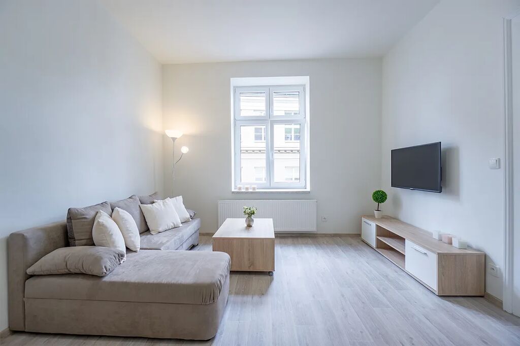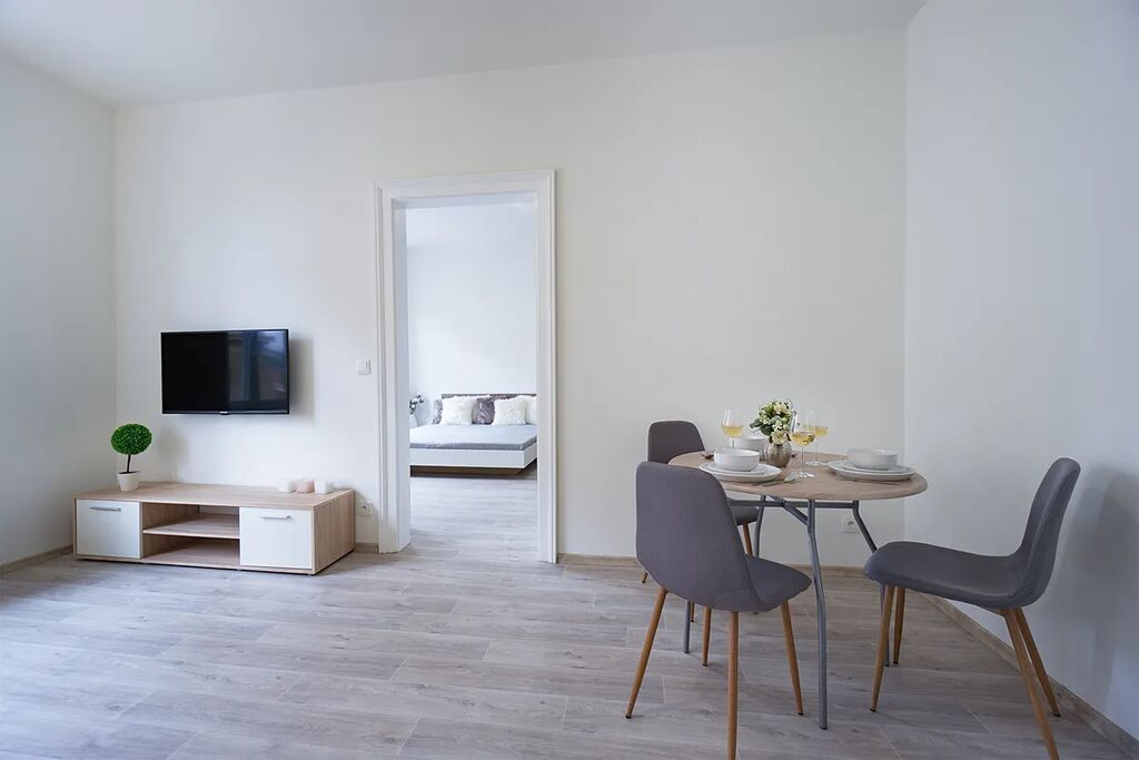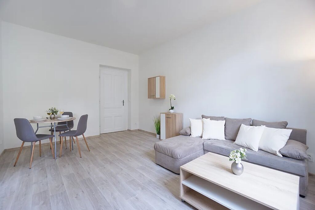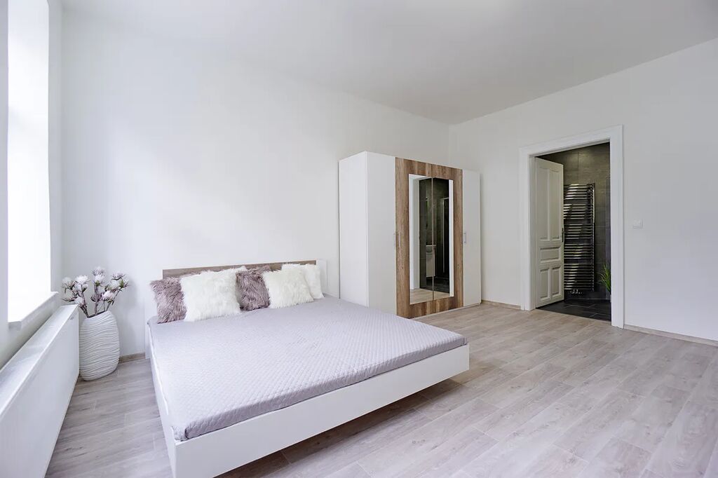 Byt se skládá z obývacího pokoje, ložnice, kuchyně, koupelny a samostatné toalety. Byt se nachází v historickém zděném domě z roku 1912 ve třetím podlaží bez výtahu.