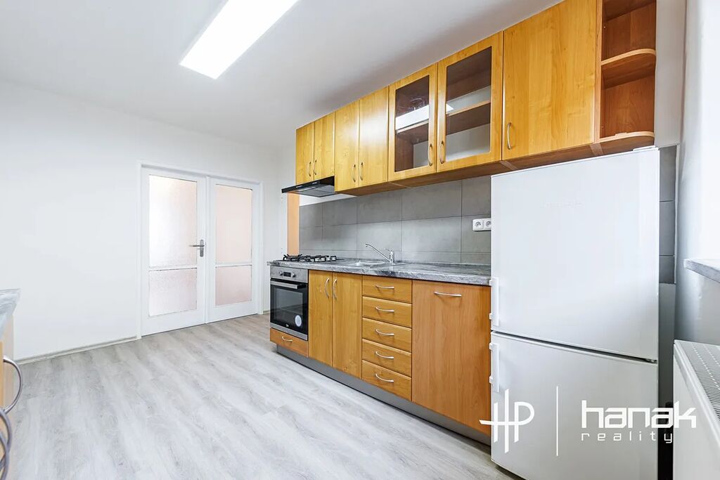 Kuchyňská linka je vybavena plynovou varnou deskou, elektrickou troubou, digestoří a lednicí s mrazákem.