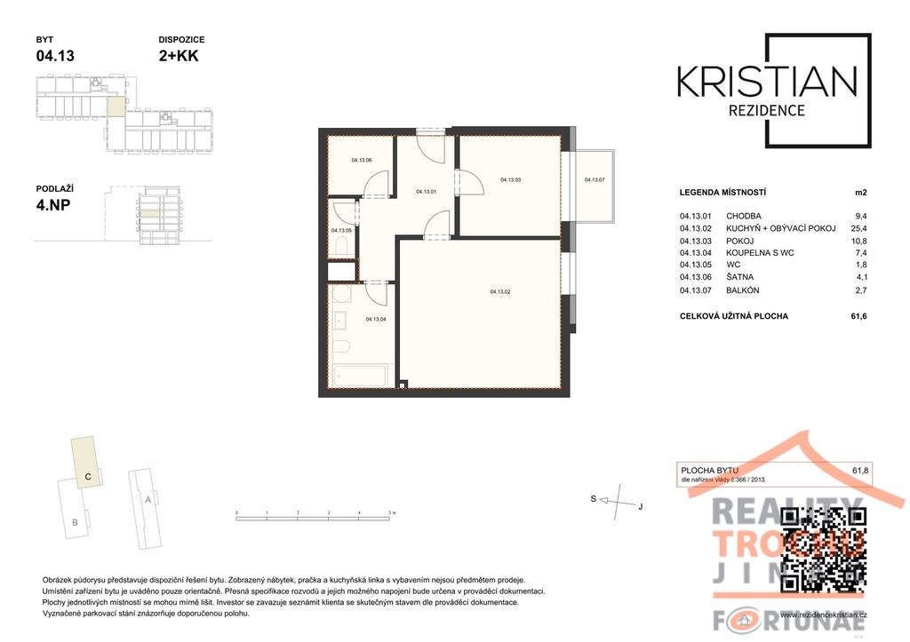 V novém developerském projektu Rezidence Kristian nabízíme prodej, moderního a nízkoenergetického bydlení v bytu 2+kk s balkónem ve vyhledávané lokalitě v Hradci Králové – Moravské Předměstí. Bytová jednotka se nachází ve 4. NP zděného bytového domu, celková užitná plocha 61,6 m2, balkón - 2,7 m2, šatna 4,1m2. K bytu náleží 1x vnitřní parkovací stání. Dispozice: vstupní chodba, obývací pokoj s kuchyňským koutem, jídelnou, ložnicí, koupelna s WC, WC, šatna. Vytápění: ústřední dálkové. Ve standardním provedení: plastová okna hranatá s izolačním trojsklem, vinylové podlahy KPP – výběr z 12 typů dekorů, koupelna s keramickou dlažbou La Ceramica Factory – výběr ze 4 dekorů, obklady Rako Systém, umyvadlo keramické se stojánkovou pákovou baterií, vana bílá akrylátová obdélníková. WC závěsné bílé. Použité materiály kombinují moderní technologie a udržitelnost a především snižují energetické náklady.