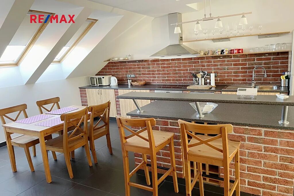 Dispozici bytu tvoří mimořádně prostorný obývací pokoj o rozloze cca 70 m² s podlahovým vytápěním a klimatizací, samostatná ložnice, koupelna a WC. V podkroví je další prosto vhodný třeba jako pracovna. K bytu náleží také balkon vhodný k odpočinku. Nájemníkům je dále k dispozici venkovní posezení s grilem, ideální pro relaxaci a společné chvíle.