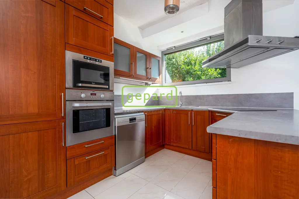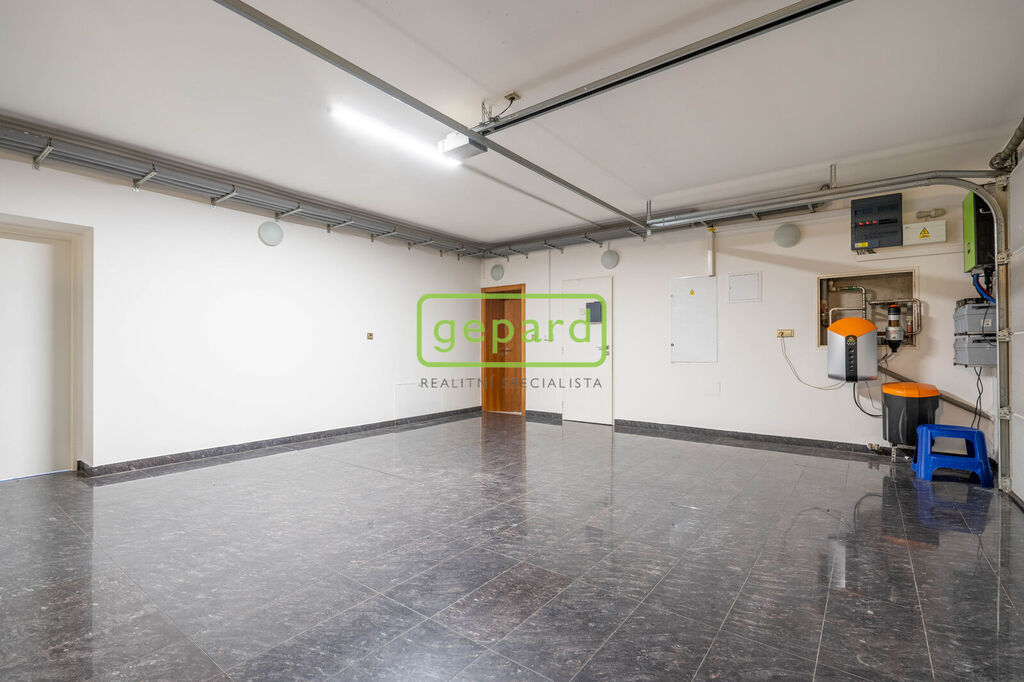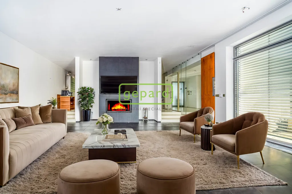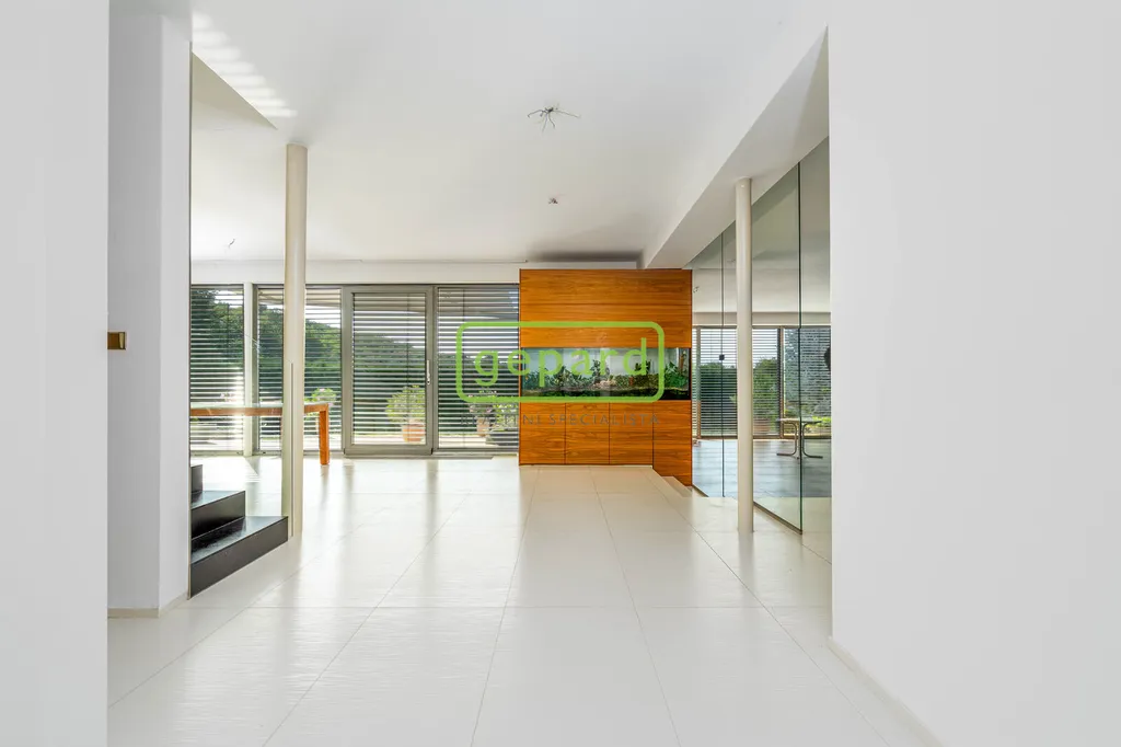 Dispozičně, v přízemí, je v pravé části domu obývací pokoj s panoramatickým výhledem do zahrady, krbem, propojený s kuchyní. Kuchyň je vybavena spotřebiči Miele, Dornbrach a Gutmann a vlastní chlazenou spíží. Navazuje na jídelnu, pracovnu, dále na šatnu a sociální zázemí. Levá část domu, je oddělena garáží pro dva automobily, má vlastní vstup do samostatného bytu s obývacím pokojem s kuchyní, ložnicí a sociálním zázemím.