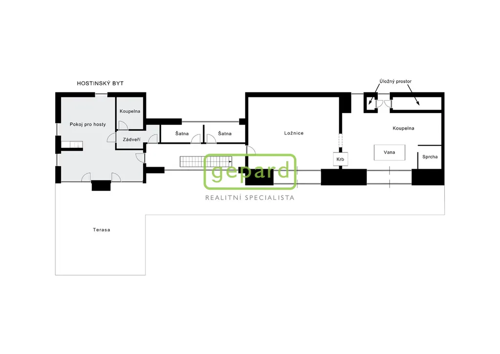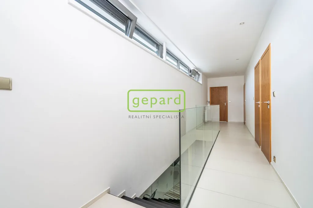 Z horních místností, včetně velké koupelny jsou vstupy na západně orientovanou terasu s otevřeným výhledem do okolní krajiny.