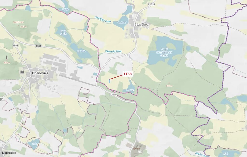 Lesní pozemek o výměře 1 323 m2, parcelní číslo 1158, podíl 1/1, katastrální území Bezděkov u Kasejovic, obec Hradiště, obec s rozšířenou působností Nepomuk, okres Plzeň-jih, Plzeňský kraj. Po těžbě.
