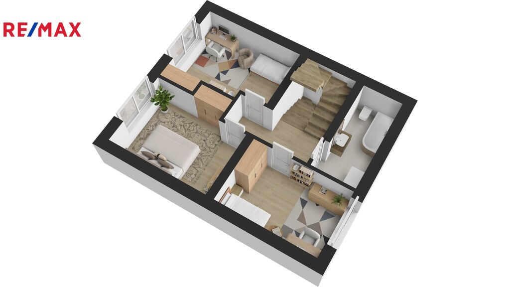 V přízemí domu bude vstupní chodba se schodištěm do patra, kde při vstupu budete mít po pravé straně koupelnu se sprchovým koutem a WC, na levé straně bude výklenek pro vestavěnou šatní skříň. Dále menší pokoj vhodný jako ložnice nebo pracovna. Rovně z chodby projdete do velkého obývacího pokoje, který bude spolu s velkým kuchyňským koutem a jídelnou dominantou celého domu. Z tohoto obývacího pokoje bude vstup na zahradu s terasou, kde si můžete postavit pergolou. Zahrada bude oplocená se zadní brankou pro pěší vstup. V chodbě domu pod schodištěm budete mít úložný prostor a v patře na vás budou čekat tři pokoje a hlavní koupelna s vanou a WC. Jako bonus vám zhotovíme plnohodnotnou velkou místnost v podkroví, kam povede běžné schodiště. Podkrovní pokoj bude mít všechny náležitosti jako jsou střešní okna, podlahovou krytinu, sádrokartonové podhledy i rozvody elektřiny. Tento podkrovní prostor můžete využít jako ložnici, pracovnu nebo hernu. Velkoformátová okna zajistí dostatek přirozeného světla a příprava na venkovní žaluzie umožní regulaci teploty v interiéru. Před domem budou dvě parkovací stání. Tepelné čerpadlo bude umístěné směrem do ulice.