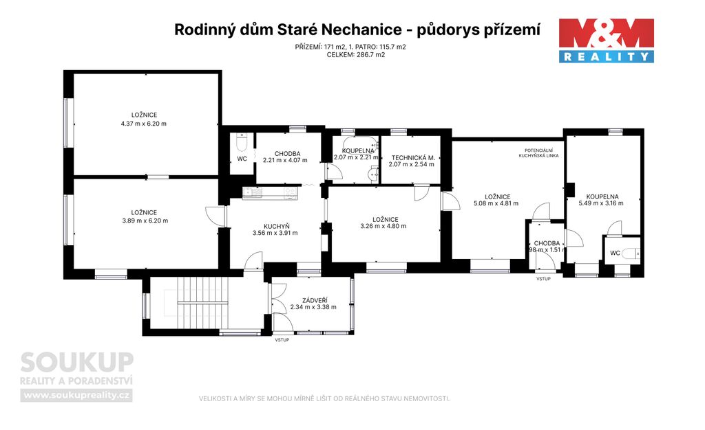 Nabízíme k prodeji prostorný rodinný dům / statek ve Starých Nechanicích po rozsáhlé rekonstrukci, vhodný pro dvougenerační bydlení i investici. V přízemí jsou připraveny dvě samostatné jednotky 2+1 a 2+kk, v 1. patře se nachází celkově obyvatelný byt 3+kk s možností využití šatny jako dalšího pokoje. Dům má plastová okna, nové rozvody, zateplené stropy a je napojen na elektřinu, vodu, kanalizaci i plyn, navíc disponuje vlastní studnou. Vytápění je řešeno plynovým kotlem, v patře jsou instalována krbová kamna a zároveň je možné využít kotel na pevná paliva i elektro kotel, přičemž vytápění lze odděleně regulovat pro každé patro. Součástí pozemku o výměře 3 698 m² jsou dvě garáže, stodola, půda a hospodářské zázemí s potenciálem přestavby na další bydlení. Před domem se nachází stavební parcela. PENB se zpracovává – aktuálně uvedena třída „G“. Doporučujeme osobní prohlídku