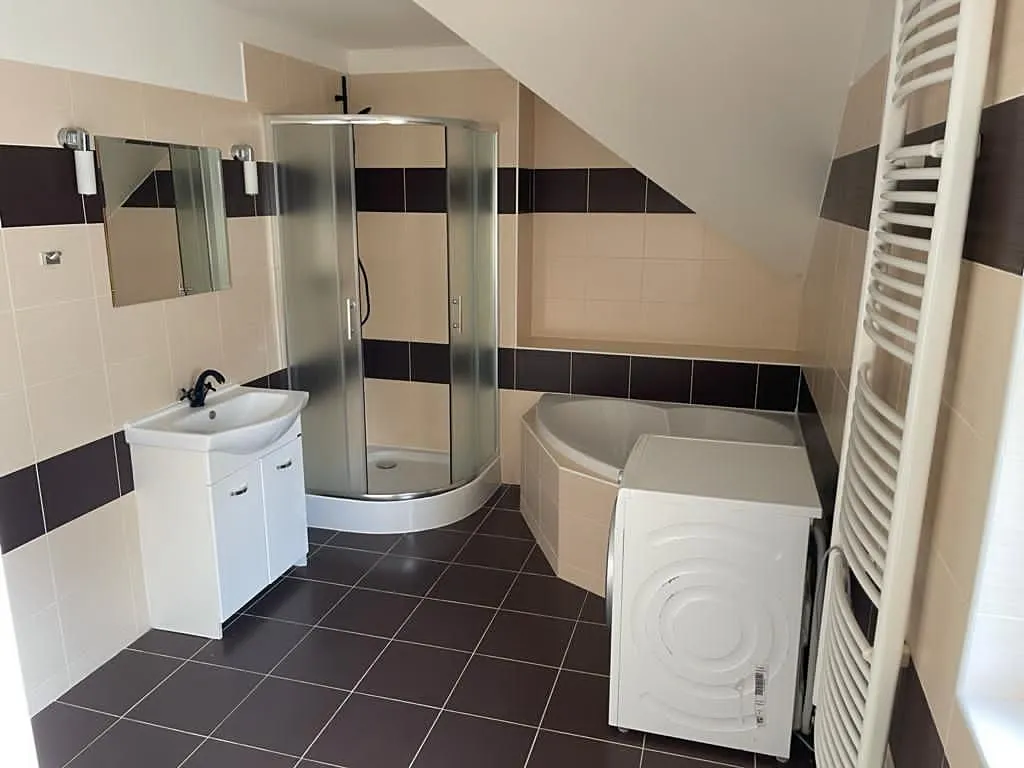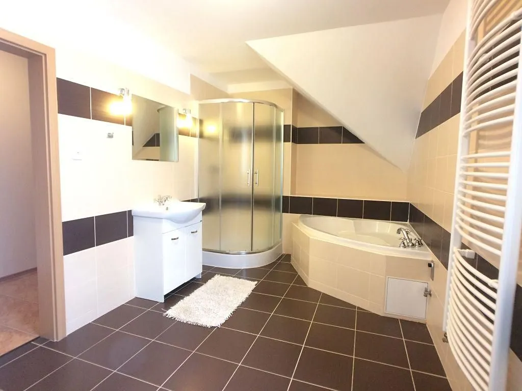 Pěkný, prostorný byt v novostavbě RD s vlastním vstupem z boku domu 1+kk 60 m2, Praha 10 - Benice, ul. Květnového povstání, 1. patro, k dispoozici terasa a zahrada, pěkná velká koupelna s rohovou vanou a sprchovým koutem, prostorná obytná místnost s kuchyňskou linkou, předsíň, vybaveno nábytkem. Internet v ceně. PENB:G