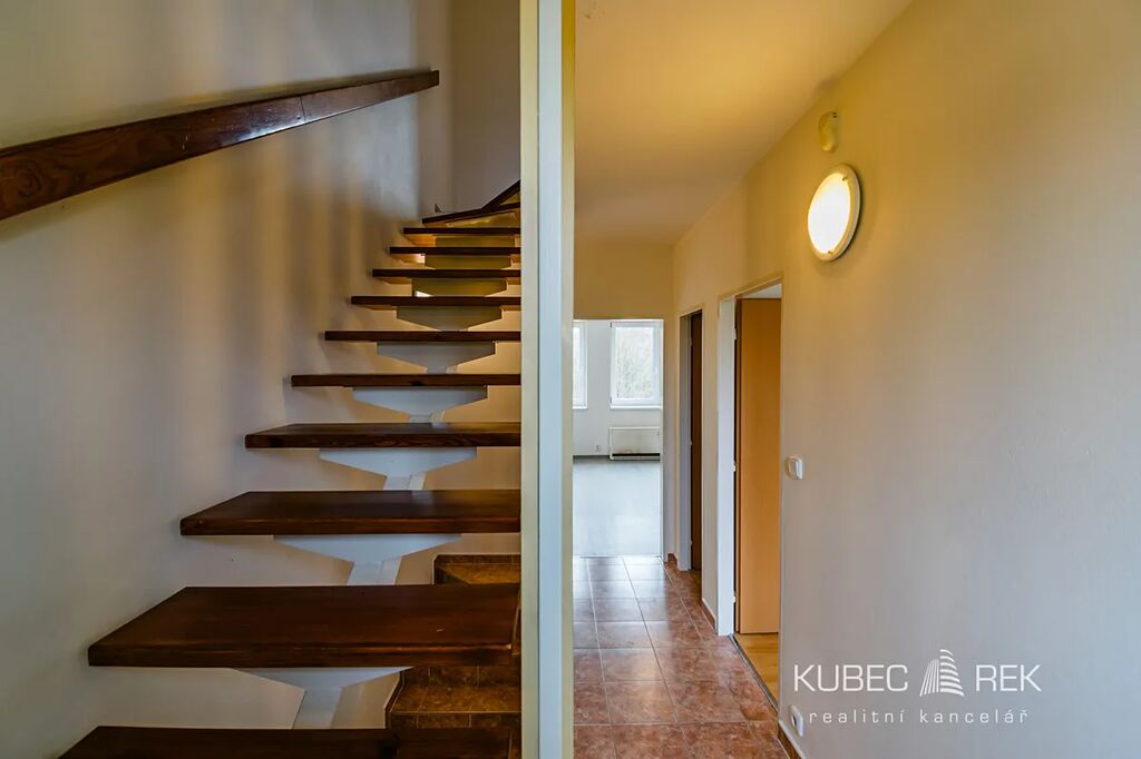 V 1. patře najdete prostorný obývací pokoj propojený s kuchyní a jídelnou, jeden pokoj a samostatné WC.