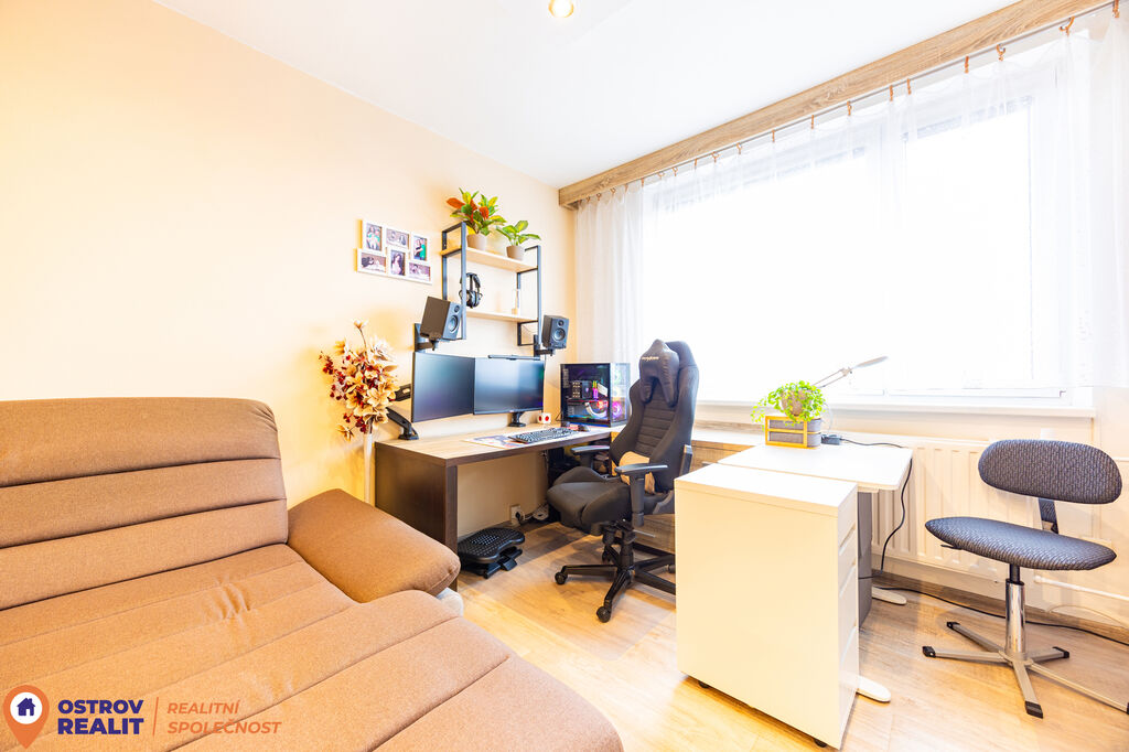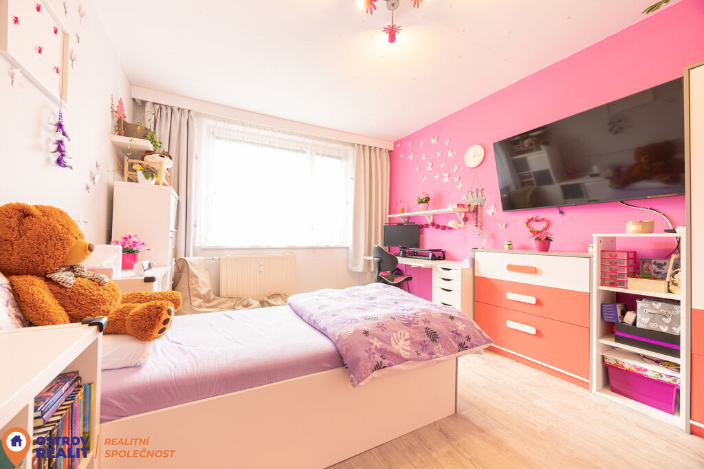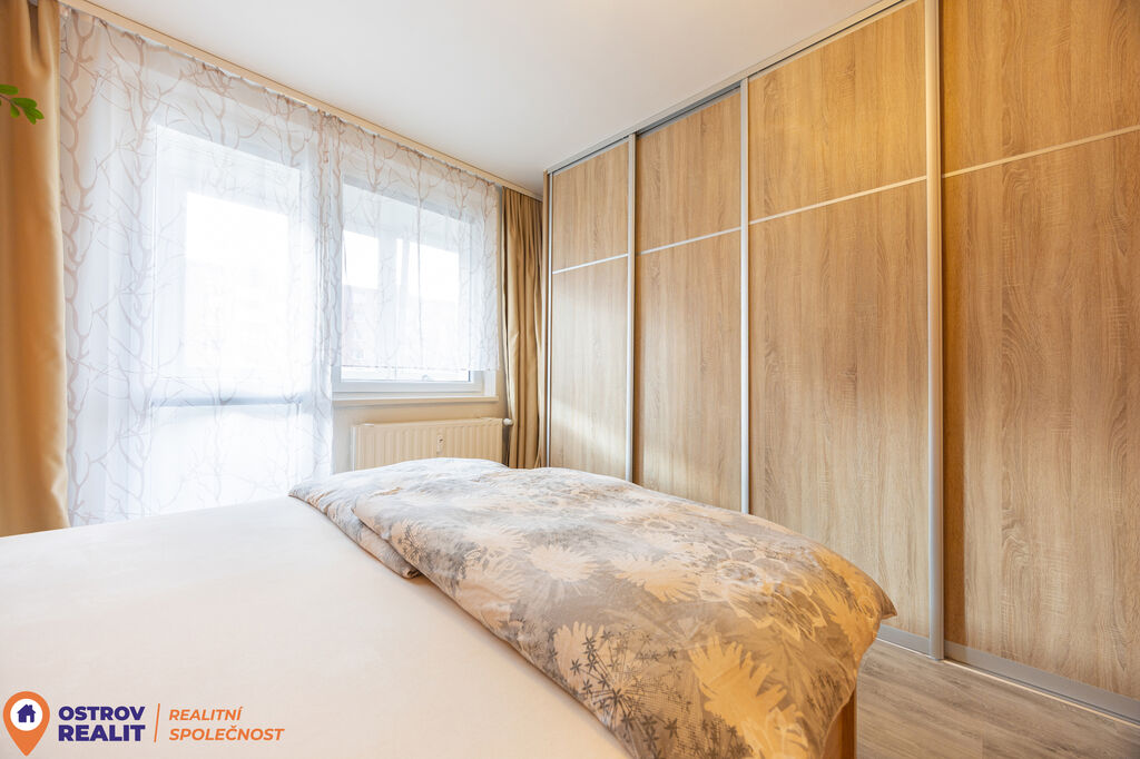 Dispozice bytu je velmi dobře řešená – nabízí dostatek úložného prostoru v komoře a samostatné, neprůchozí, dobře využitelné pokoje. Z ložnice je vstup do zasklené lodžie, která poskytuje příjemné místo k posezení i za horšího počasí.