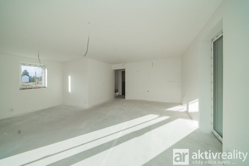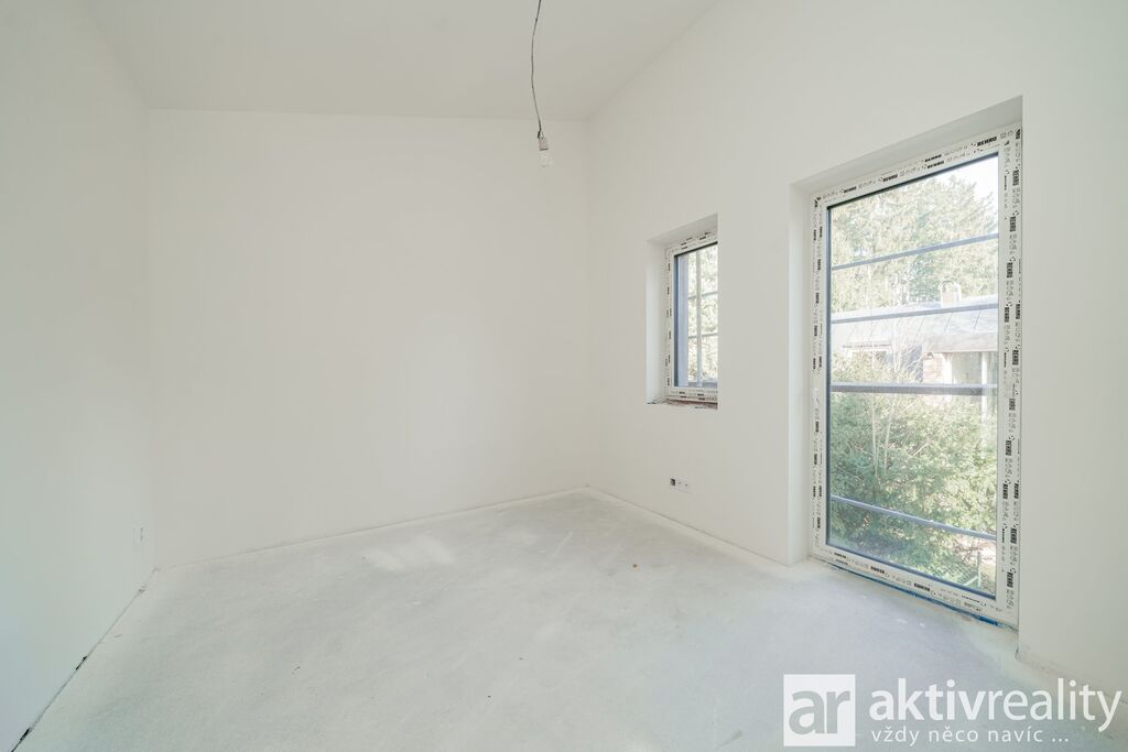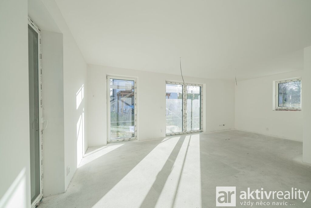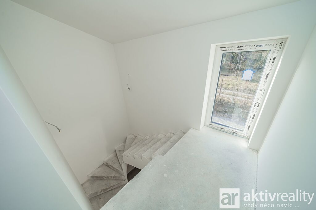 Dům je vybaven moderním tepelným čerpadlem vzduch–voda napojeným na podlahové vytápění v celém domě, což zajišťuje stabilní teplotní komfort a nízké provozní náklady. Plastová okna s izolačními trojskly doplňuje venkovní stínění na elektrický pohon. Koupelny jsou řešeny v nadčasovém stylu a vybavené kvalitní sanitou Hansgrohe a Laufen. Součástí domu je také příprava na krbová kamna včetně komínu, což budoucím majitelům umožňuje doplnit interiér o další prvek tepelné pohody. Podlahy v domě byly zvoleny s důrazem na kvalitu i estetiku – celé přízemí je provedeno ve velkoformátové dlažbě 120×120 cm v dekoru mramoru, která dodává prostoru moderní vzhled a je zároveň praktická pro rodinný provoz. Schodiště a celé horní podlaží jsou osazeny vinylovou podlahou v dekoru přírodního dubu, která přináší příjemně teplý charakter a vizuální kontinuitu interiéru.