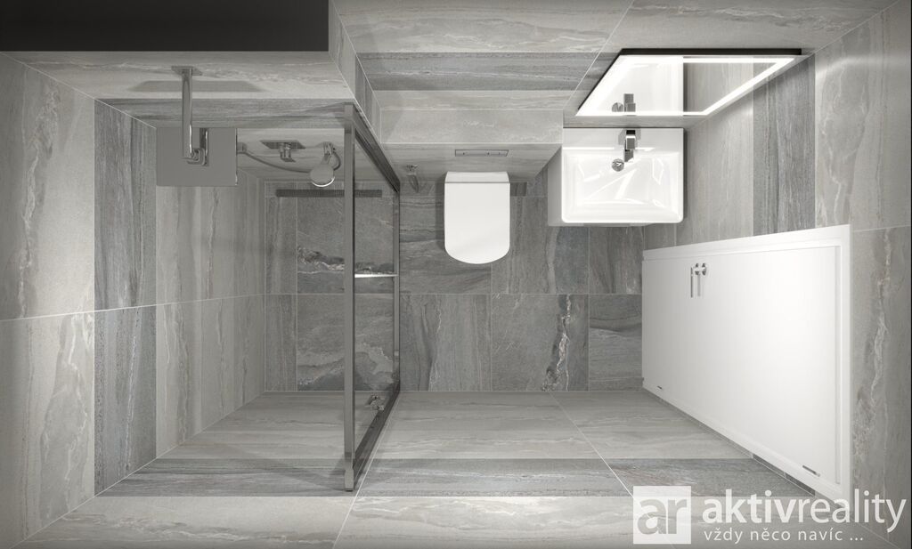 V přízemí se nachází prostorná společenská část domu tvořená obytným prostorem s kuchyňským koutem, odkud je přímý vstup na venkovní terasu. Součástí přízemí je také vstupní chodba, koupelna, technická místnost a krytá garáž se vstupem přímo do interiéru. Tento koncept umožňuje pohodlné každodenní fungování, zejména při nákupech, v nepříznivém počasí nebo při pohybu s dětmi.