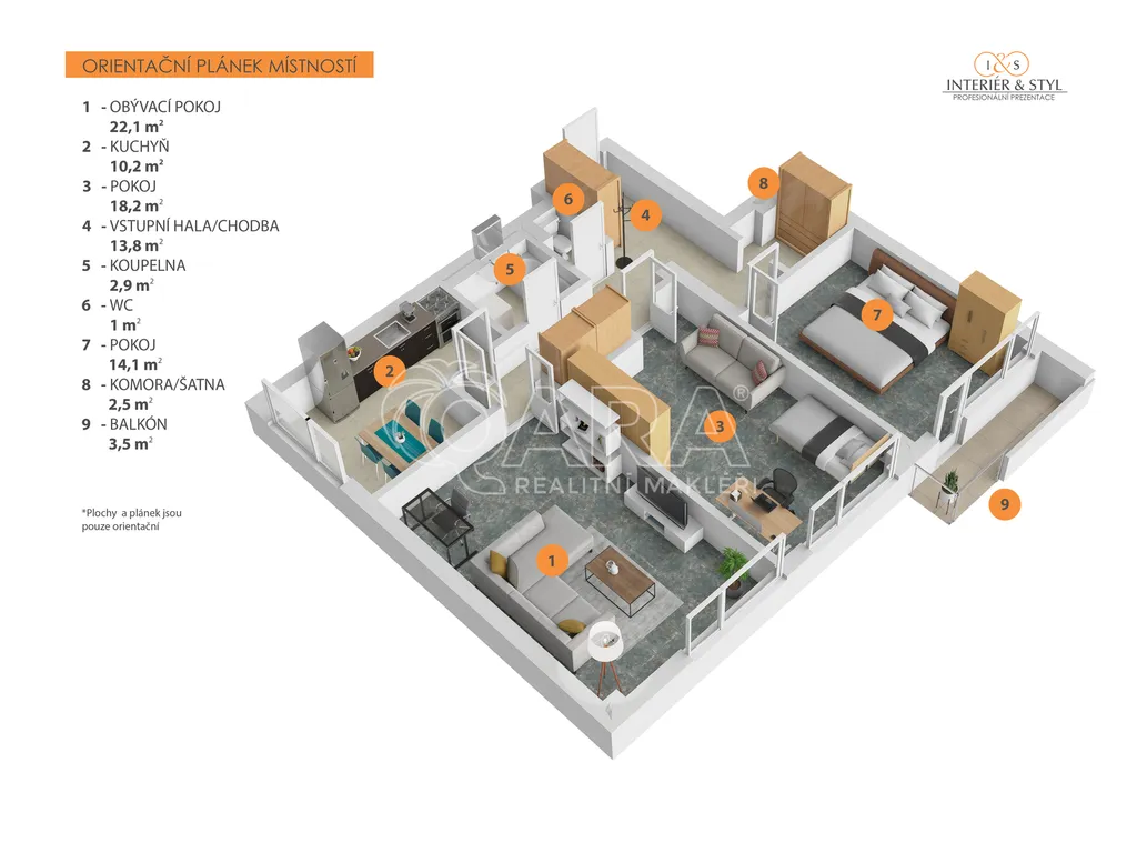 Dispozice a plocha: Komfortní 3+1 o velikosti 85 m² s lodžií 3,3 m² a sklepem.
