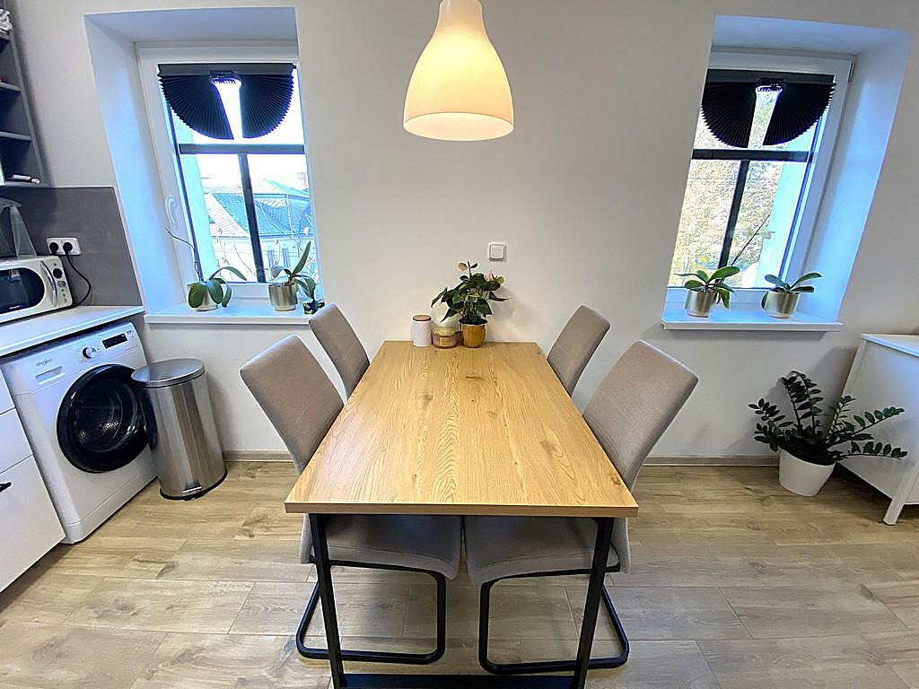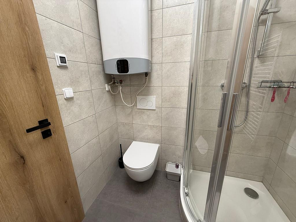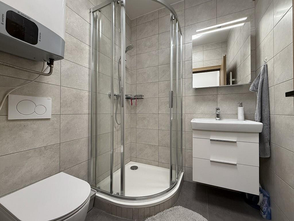 Za vchodovými dveřmi se ocitneme v prostorné chodbě (cca 3,14 m²), ze které je vstup do velké koupelny (cca 2,65 m²). Koupelna s WC je vybavena umyvadlovou skříňkou, umyvadlem, velkým zrcadlem, WC a sprchovým koutem. Hlavní dominantou bytu je pokoj s kuchyňským koutem (cca 24,10 m²), který disponuje novou kuchyňskou linkou, jejíž součástí je digestoř, elektrická trouba, elektrická sklo-keramická deska a pračka. Lednička s mrazákem zde není, ale majitel v případě zájmu lednicí s mrazákem byt dovybaví. V tomto pokoji je také široké točité schodiště vedoucí do mezonetu, kde je pokoj (galerie) o výměře (cca 21,39 m²) s přiznanými trámy a střešním oknem. V místnosti je klimatizace značky LG, která chladí i vytápí. V přízemí nesmíme opomenout ani další samostatný pokoj (cca 13,21 m²), který může sloužit jako obývací, ale i jako ložnice.