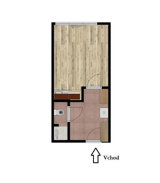 Vstupními dveřmi vcházíme do chodby (cca 2,80 m²), která je vybavena vestavěnými skříněmi, lednicí a vstupy do koupelny s WC a pokoje s kuchyňským koutem. Po levé straně se nachází koupelna s toaletou o velikosti cca 2,30 m², která disponuje toaletou, sprchovým koutem, umyvadlem a koupelnovou skříňkou. Hlavní dominantou bytu je pokoj s kuchyňským koutem o výměře cca 15 m², ve kterém se nachází menší kuchyňská linka s elektrickým sporákem s troubou a přípojkou na pračku. Tento pokoj se dále nabízí bez vybavení a je orientovaný na východ.