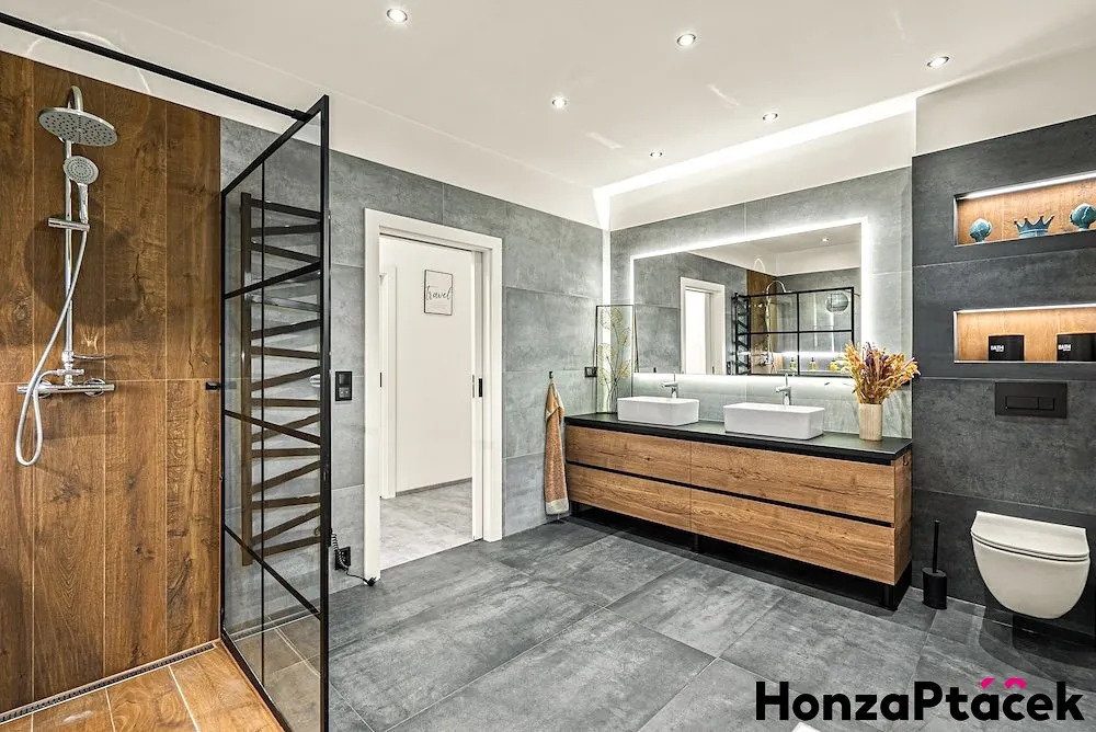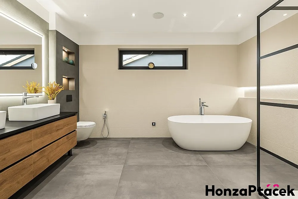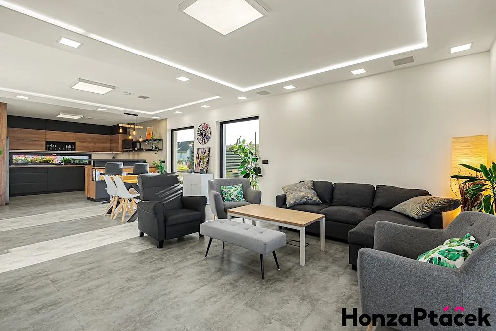 Dům nabízí vysoký komfort – podlahové vytápění ve všech místnostech, trojskla s venkovními žaluziemi a inteligentní systém Loxone, který řídí vytápění, osvětlení, žaluzie, vstup i bezpečnostní prvky. Samozřejmostí je zabudovaný audio systém a příjemné noční podsvícení.