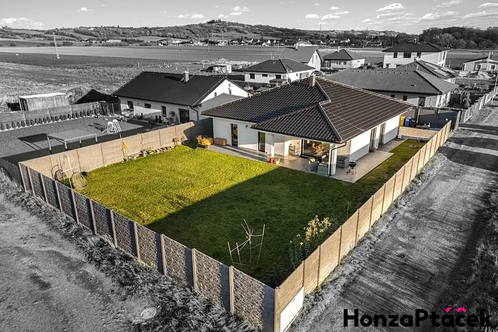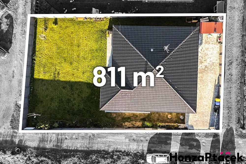 Rovinatý pozemek o rozloze 811 m² je plně oplocený a ideální pro relaxaci, zahradní úpravy nebo dětské zázemí. Díky promyšlenému osazení domu nabízí skutečné soukromí. Dešťová voda je sbírána do podzemní retenční nádrže. Parkování pohodlně přímo na pozemku.