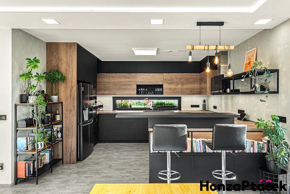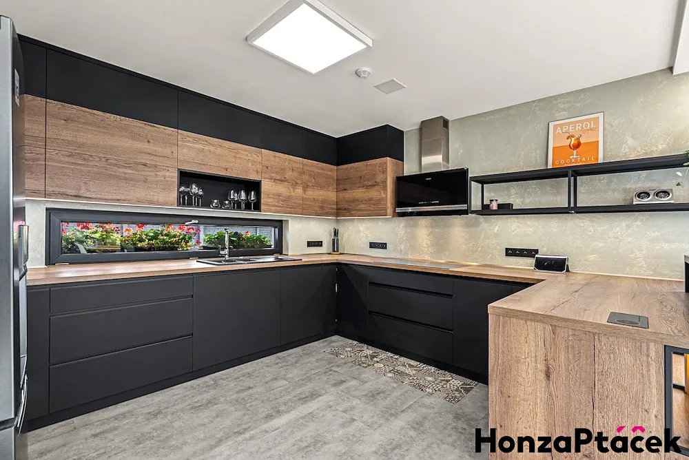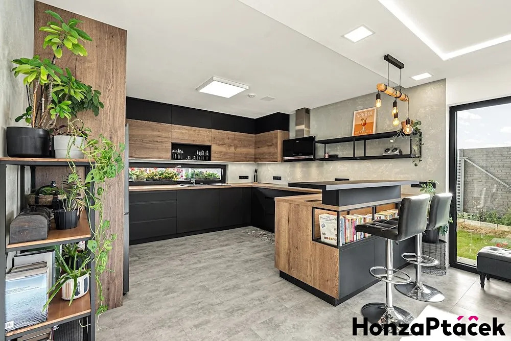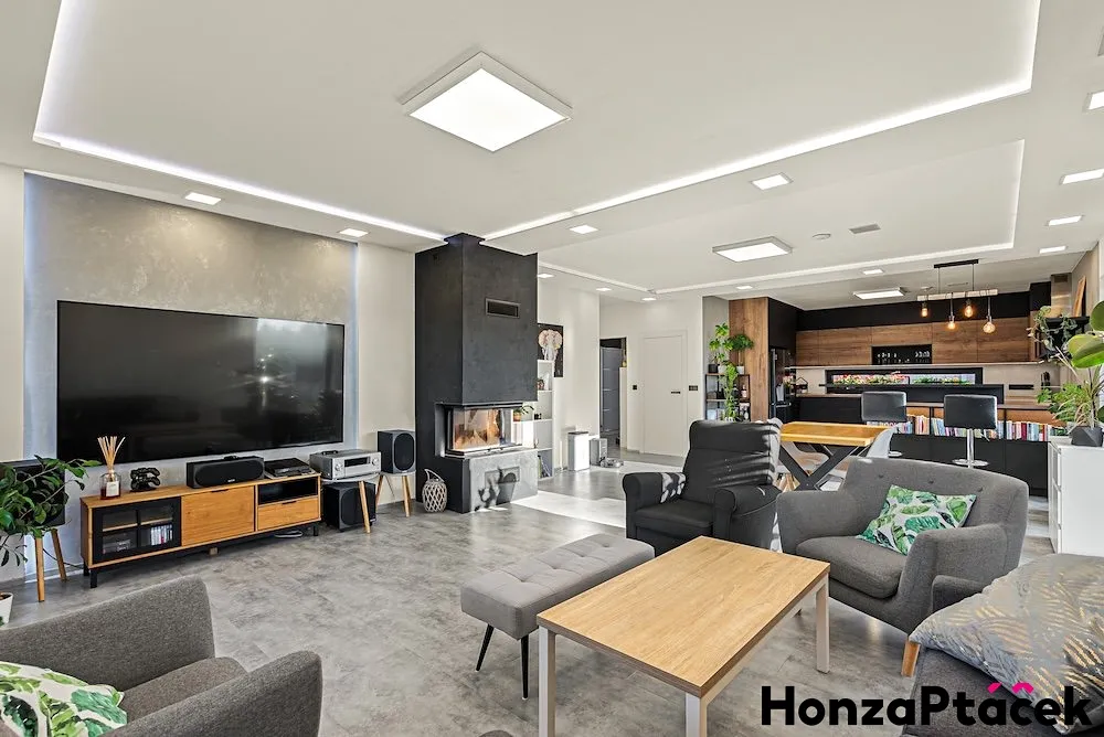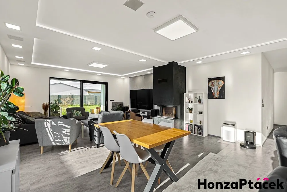 Užitná plocha 147 m² je rozvržená tak, aby každý prostor dával smysl. Srdcem domu je prostorný obývací pokoj s krbem a velkými francouzskými okny, který propojuje interiér se zahradou. Na něj navazuje kuchyň s linkou na míru a vestavěnými spotřebiči Siemens. K dispozici je také technická místnost se sprchou, praktická spíž a šatna přímo u ložnice.