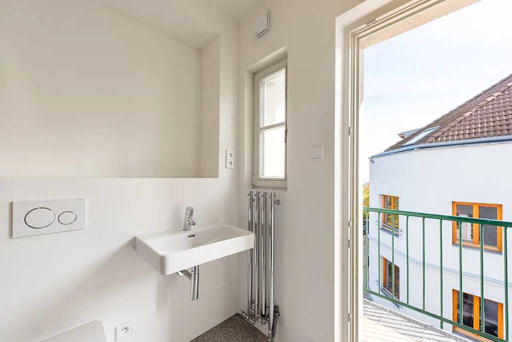 Dispozice bytu ve třetím nadzemním podlaží je koncipována s důrazem na velkorysost a jasnou prostorovou logiku. Dominantou je propojený obytný prostor orientovaný do klidového vnitrobloku, připravený pro instalaci kuchyně i krbu. Na hlavní obytnou část navazuje jižně situovaná terasa a lodžie, které přirozeně rozšiřují životní prostor do exteriéru. Součástí bytu jsou tři promyšleně umístěné pokoje s dostatkem soukromí a dvě koupelny. Jedna z koupelen se vyznačuje kultivovaným řešením s volně stojící vanou umístěnou u okna, kde přirozené světlo zvýrazňuje kvalitu použitých materiálů i celkový architektonický výraz. Druhá koupelna se sprchovým koutem, elegantně začleněná do místa původní lodžie, otevírá přímý vstup na balkon a nabízí autentický výhled do jedné z nejpůvabnějších uliček Starých Střešovic.