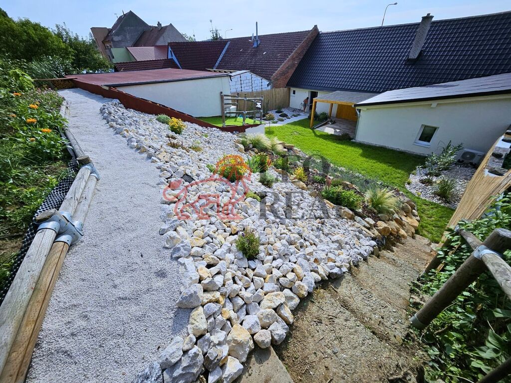 Zahrada (cca 600 m²) je rozdělená na dvě části – rovnou se zastřešenou pergolou a relaxační svahovitou část s výsadbou, ohništěm a výhledem do zeleně.