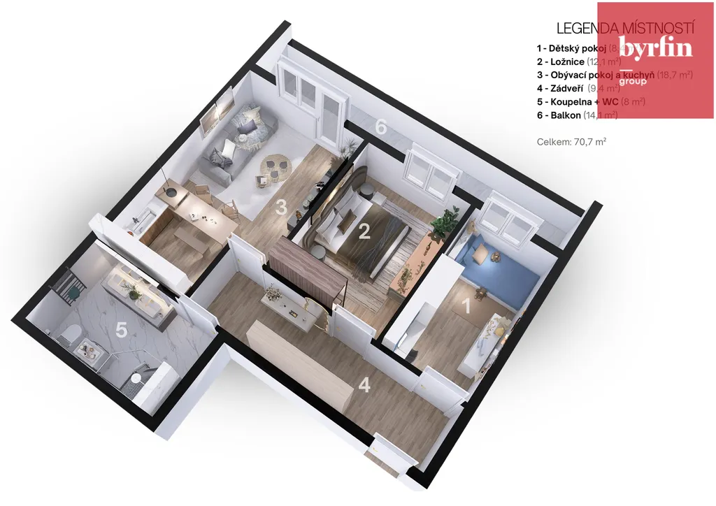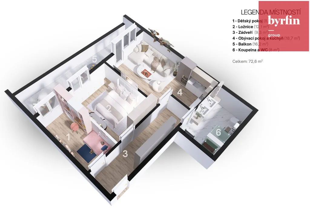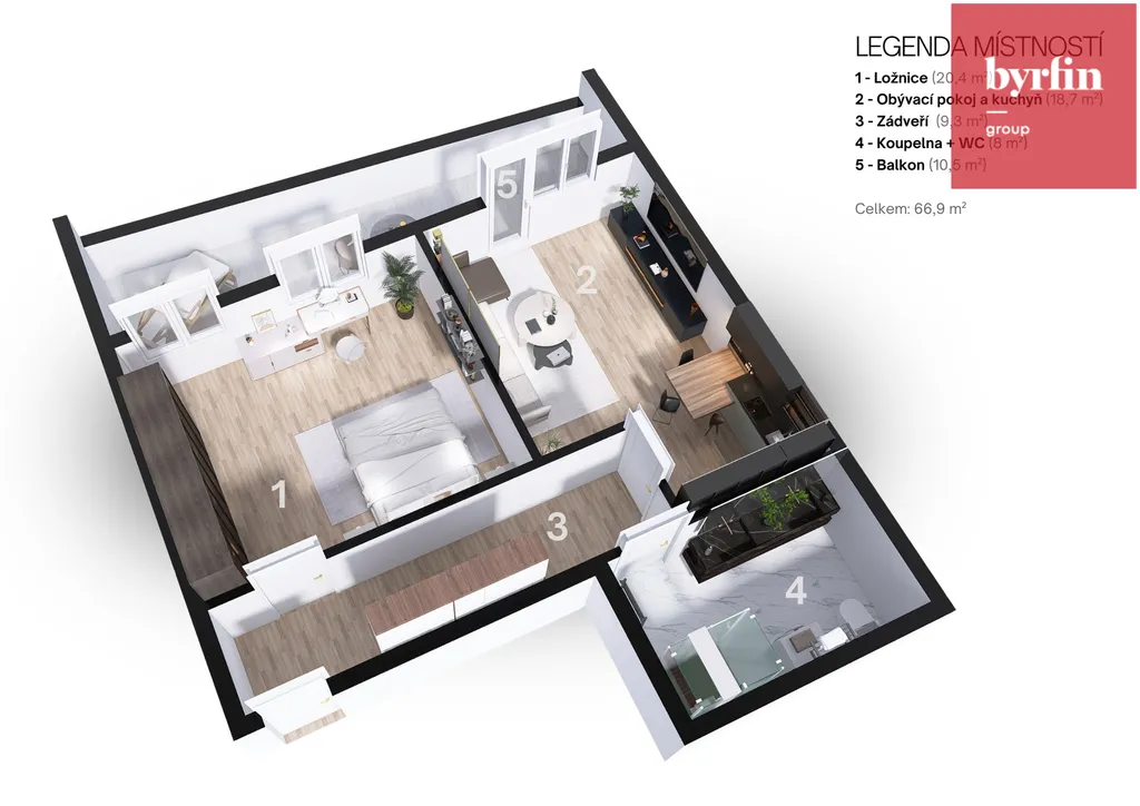 5. NP: Jeden byt 2+kk o velikosti 46 m² s balkonem 16 m² a jeden byt 3+kk o velikosti 59 m² s balkonem 14 m².