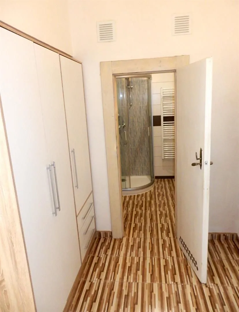 Obývací pokoj je průchozí s ložnicí ( 12,7 m2 ), ve které je umístěna manželská postel se dvěma nočními stolky a prostorná šatní skříň. V předsíni je k dispozici další vestavěná skříň, botník a věšák na kolo. Naproti vstupu do bytu se nachází koupelna ( 3,9 m2 ) se sprchovým koutem, umývadlem a pračkou se sušičkou, nad kterou je umístěn elektrický bojler ( 120 l ). Z předsíně se ještě vstupuje do samostatné toalety ( 1,5 m2 ), která je umístěna vpravo od vstupu do bytu, vedle koupelny.