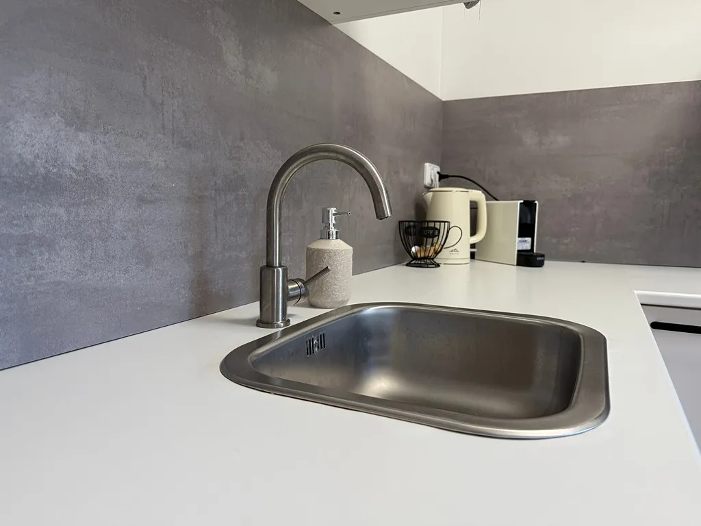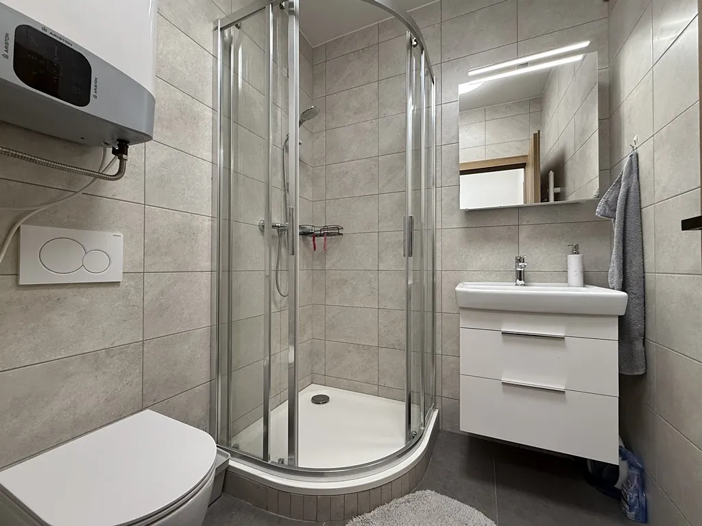 Za vchodovými dveřmi se ocitneme v prostorné chodbě (cca 3,14 m2), ze které je vstup do velké koupelny (cca 2,65 m2). Koupelna s WC je vybavena umyvadlovou skříňkou, umyvadlem, velkým zrcadlem, WC a sprchovým koutem. Hlavní dominantou bytu je pokoj s kuchyňským koutem (cca 24,10 m2), který disponuje novou kuchyňskou linkou, jejíž součástí je digestoř, elektrická trouba, elektrická sklo-keramická deska a pračka. Lednička s mrazákem zde není, ale majitel v případě zájmu lednicí s mrazákem byt dovybaví. V tomto pokoji je také široké točité schodiště vedoucí do mezonetu, kde je pokoj (galerie) o výměře (cca 21,39 m2) s přiznanými trámy a střešním oknem. V místnosti je klimatizace značky LG, která chladí i vytápí. V přízemí nesmíme opomenout ani další samostatný pokoj (cca 13,21 m2), který může sloužit jako obývací, ale i jako ložnice.