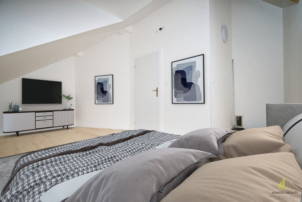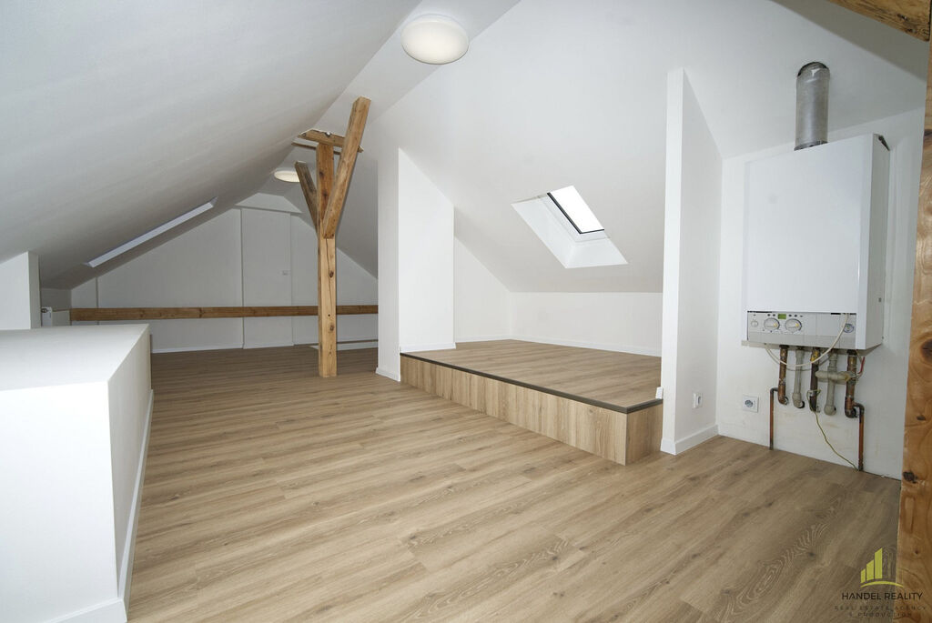 Schodiště vás zavede do podkrovního pokoje, kde se nachází menší relaxační prostor nebo pracovní koutek – ideální pro ty, kteří potřebují klidné místo pro práci nebo odpočinek. Původní krov bytu přidává na charakteru a jedinečnosti prostoru. V přízemí se nachází prostorná ložnice a moderně zařízená koupelna, která splní veškeré vaše požadavky na komfort.