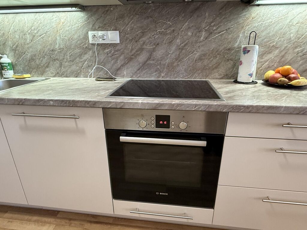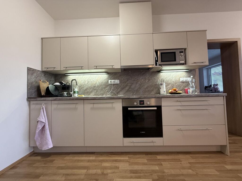 Součástí vybavení kuchyňské linky je: sklokeramická varná 4 plotýnková deska, el. trouba, digestoř, mikrovlnná trouba. Lednici nutno mít svoji vlastní, příprava na myčku je.