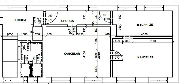 Pronajmeme prostory vhodné jako kanceláře nebo zázemí pro administrativu a služby v 1. patře budovy s vlastním samostatným vchodem. Jedná se o 3 místnosti o celkové ploše 68 m² doplněné sociálním zázemím (viz půdorys). Prostory jsou centrálně vytápěny.