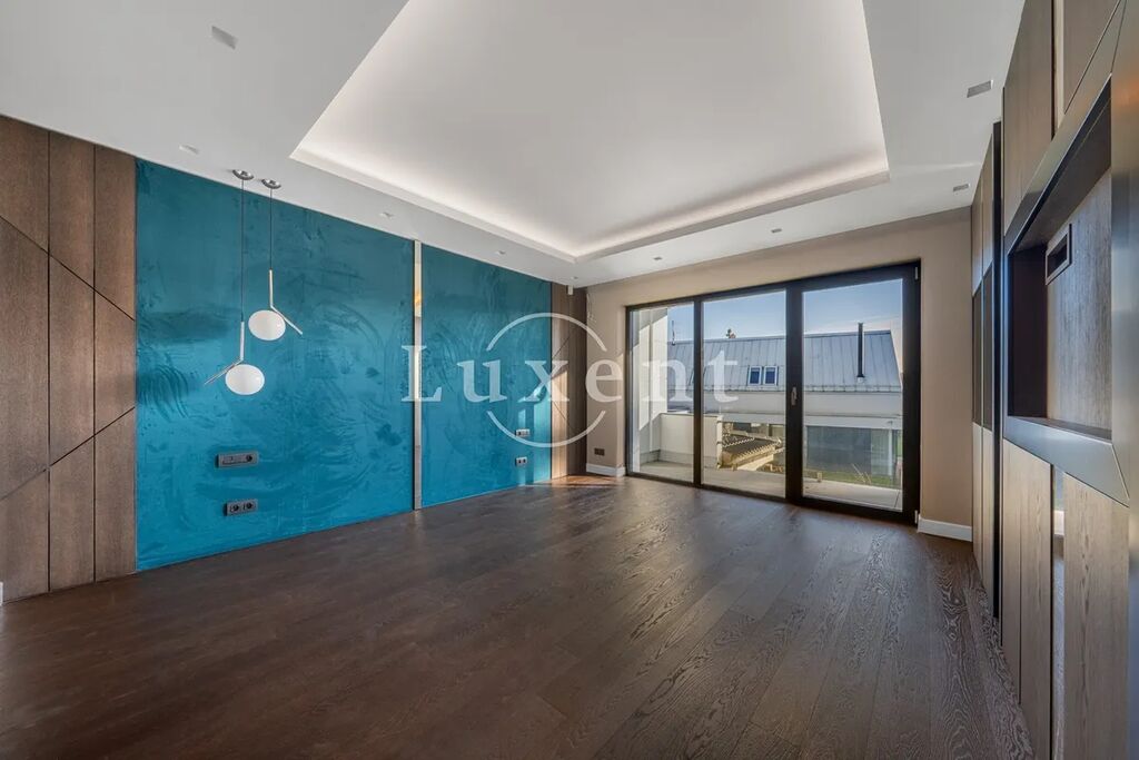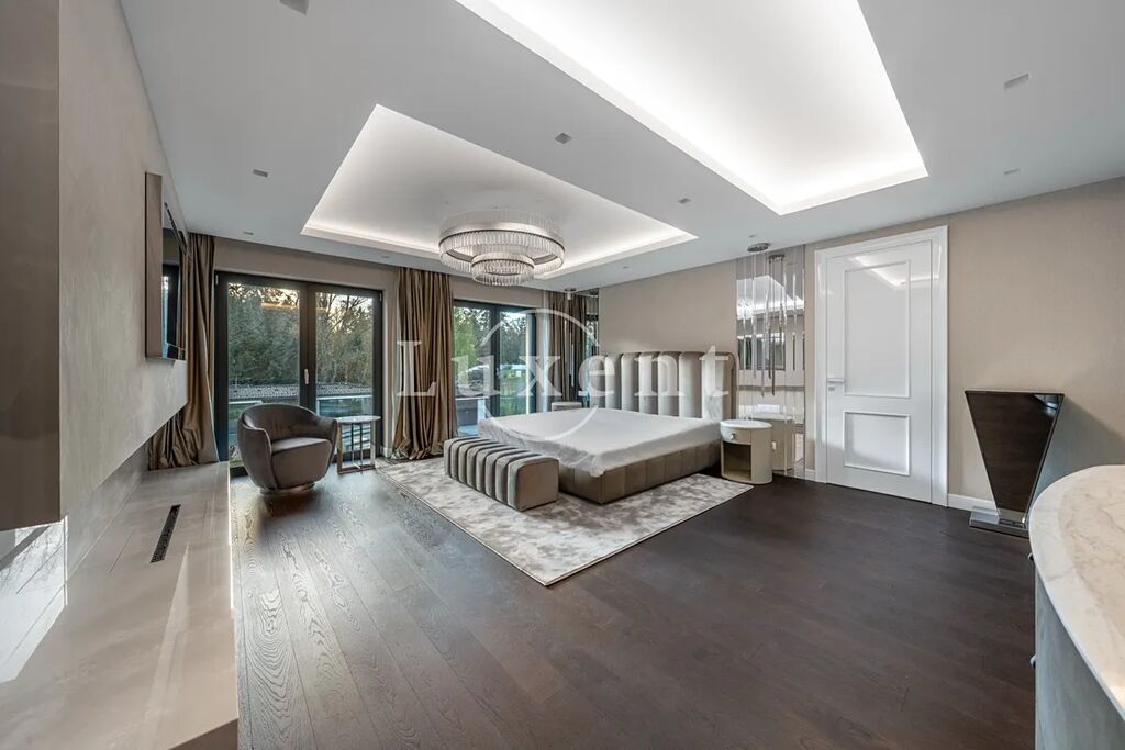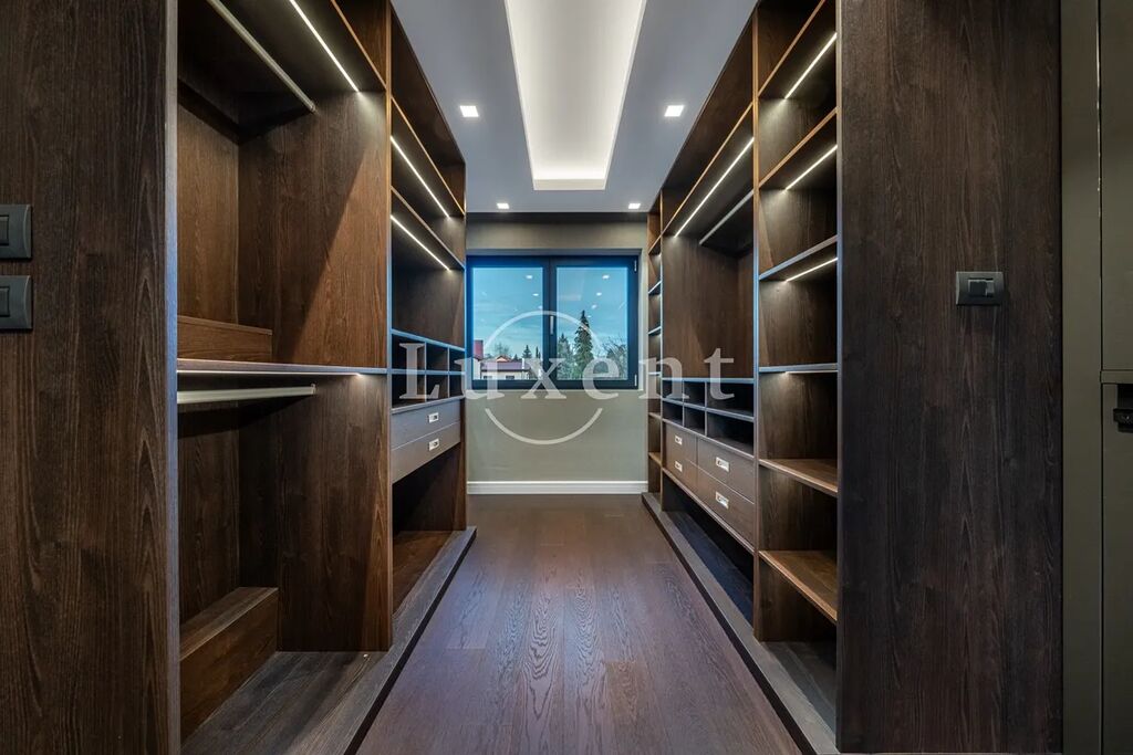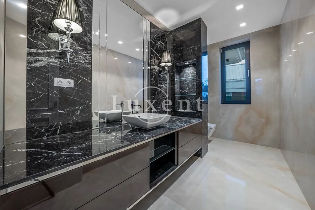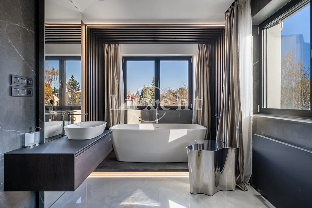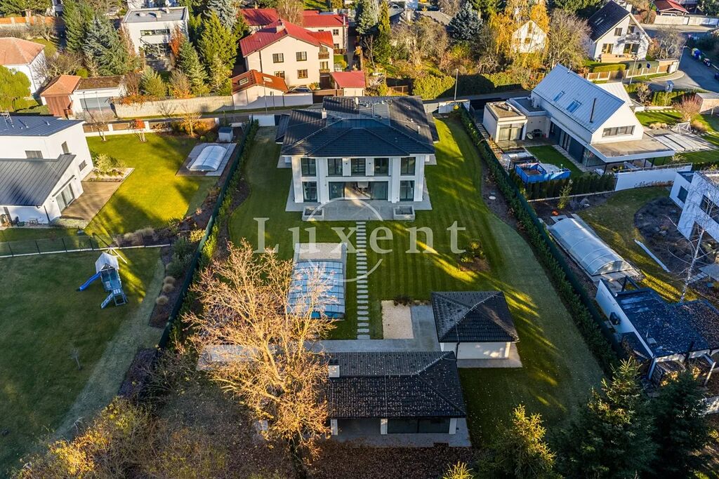 V prvním patře se nacházejí dvě hlavní ložnice, každá s vlastní šatnou, dále dvě luxusní koupelny vybavené sanitou Gessi, volně stojící vanou či walk-in sprchou. Součástí je také pracovna (možné užívat jako další ložnici) a dvě terasy, které poskytují prostor pro odpočinek i práci v soukromí. Pro potřeby další ložnice je možné provést dispoziční úpravu. Dům je vybaven smart home systémem, klimatizací, podlahovým vytápěním a elektronicky ovládanými venkovními žaluziemi i interiérovými závěsy. Pro maximální pohodlí je připravena studie na instalaci výtahu. Bezpečnost zajišťuje rozsáhlý kamerový systém i zabezpečovací zařízení. Součástí nemovitosti je rovněž garáž pro dva vozy, další čtyři auta je možné parkovat před domem na zpevněné ploše či realizovat konstrukční zastřešení.